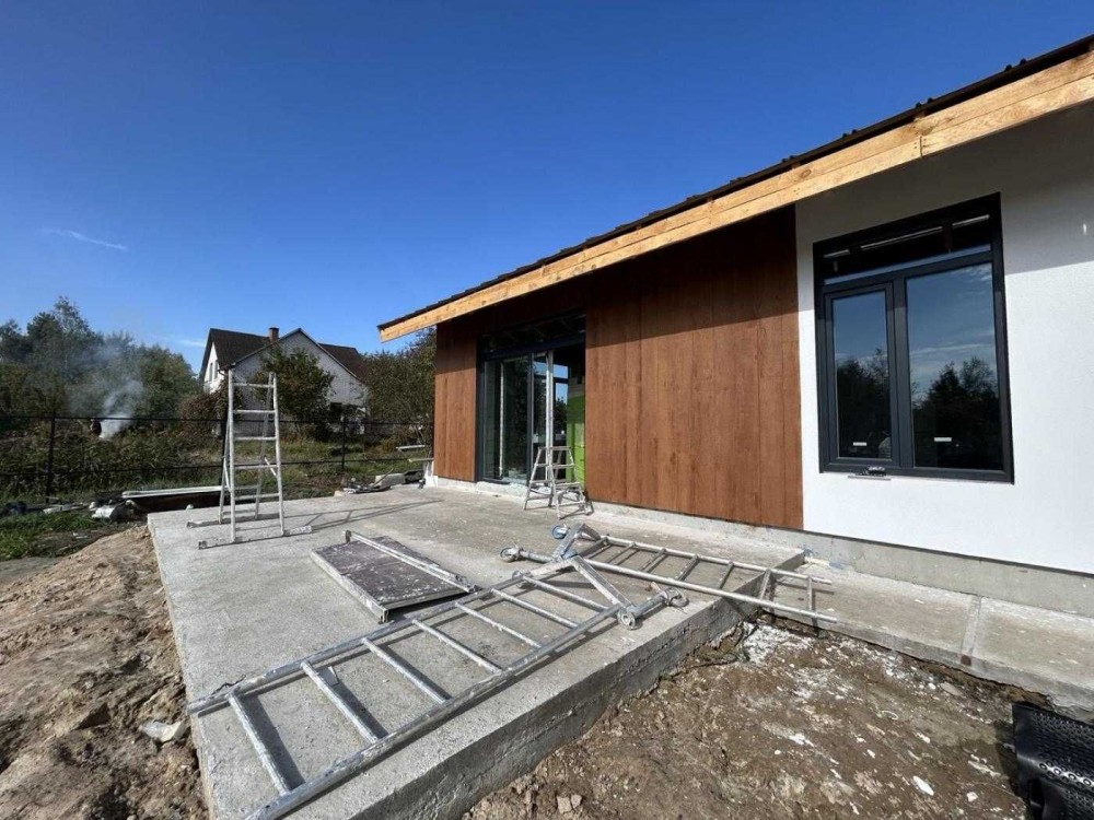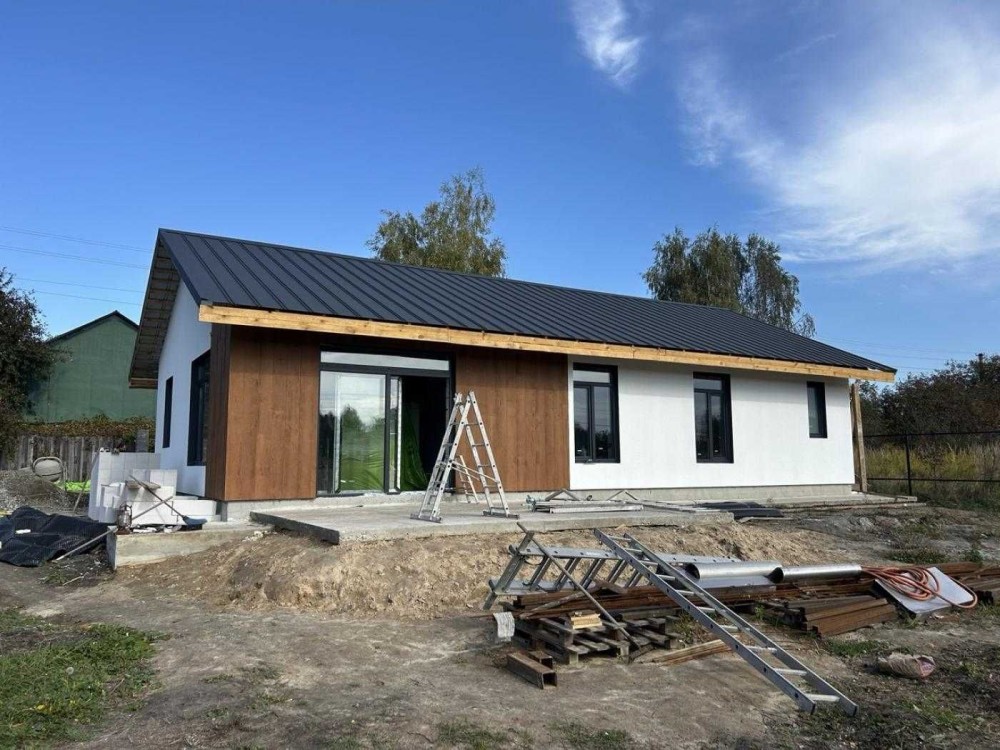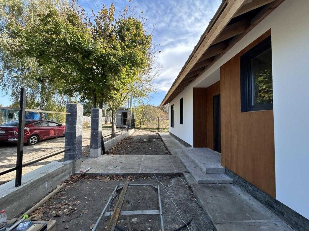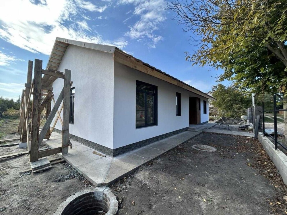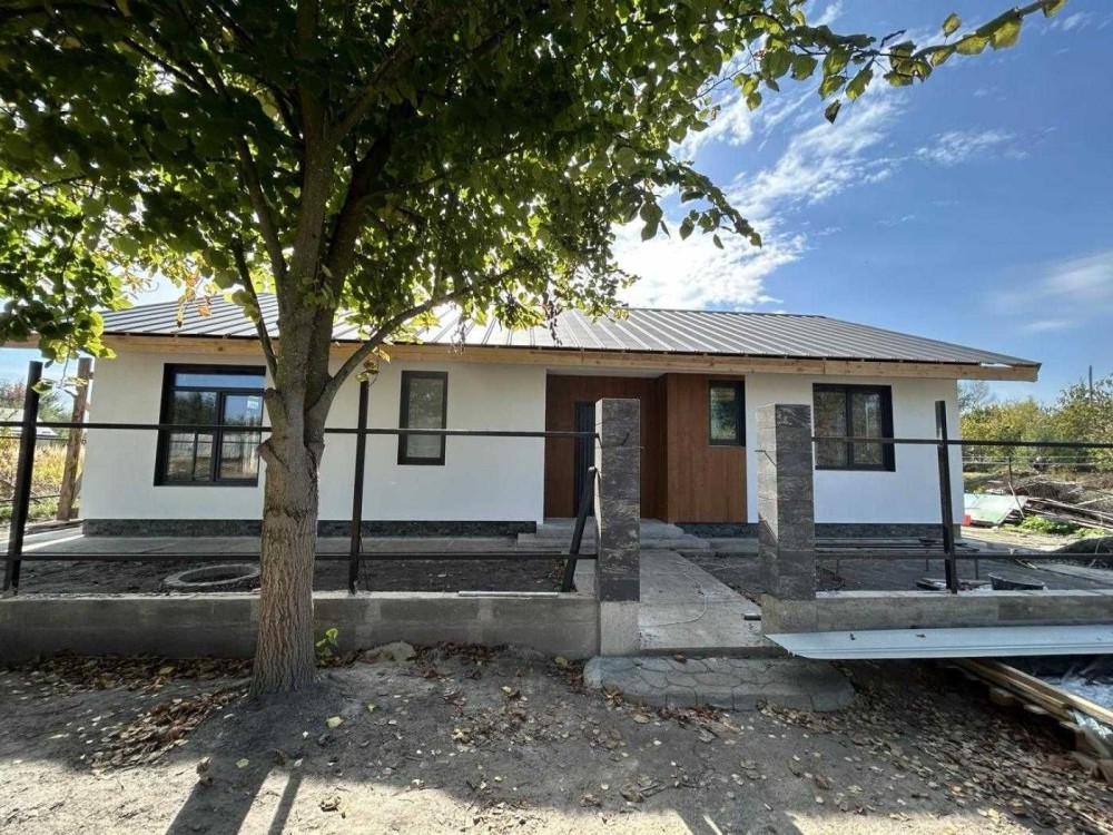 Одноповерховий будинок площею 96 м² зведений на просторій ділянці 10 соток. Сучасні матеріали будівництва: стіни з газоблоку з утепленням пінопластом, дах накритий бітумною черепицею, утеплений.