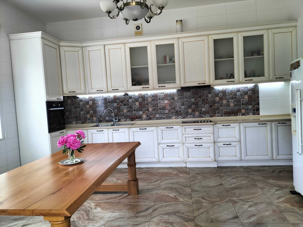 Кухня обладнана меблями, робоча поверхня камінь. Холодильник Side-by-side Whirlpool, електроплита Gorenje з керамічним покриттям, електрична духовка Bosh з функціями мікрохвильової пічки та самоочистки, посудомийна машина Gorenje на 13 комплектів, фільтр для питної води зворотного осмосу.