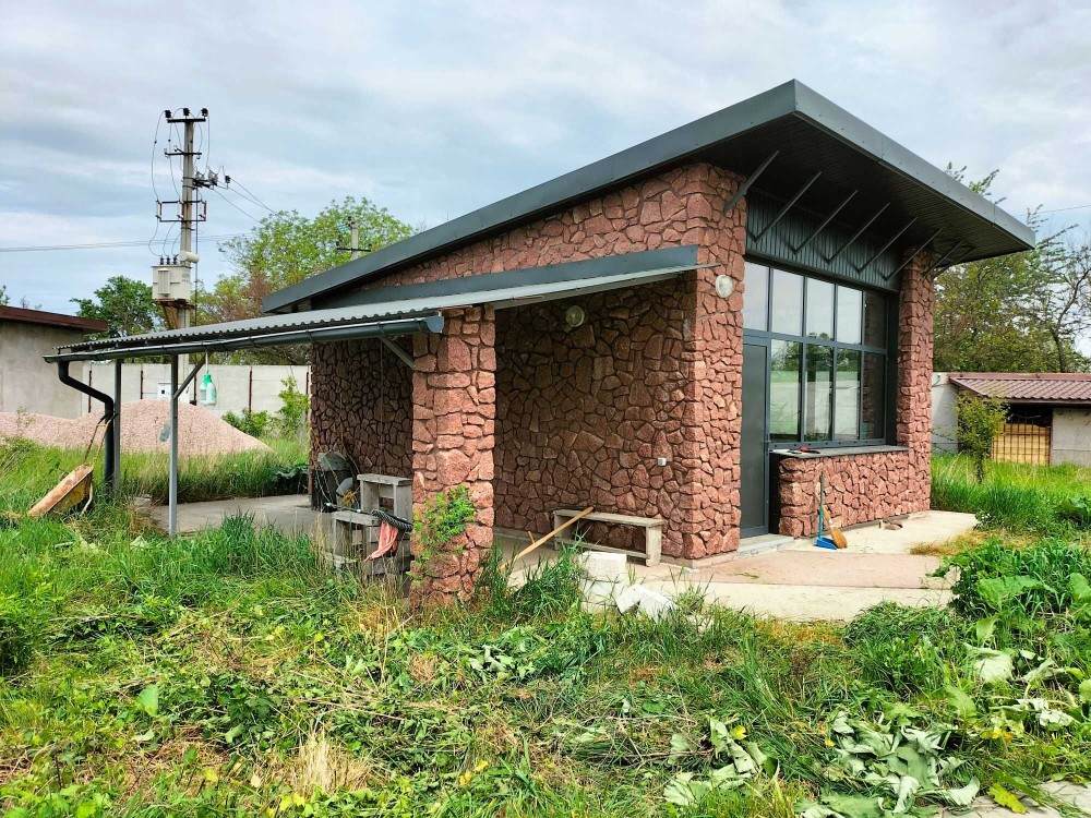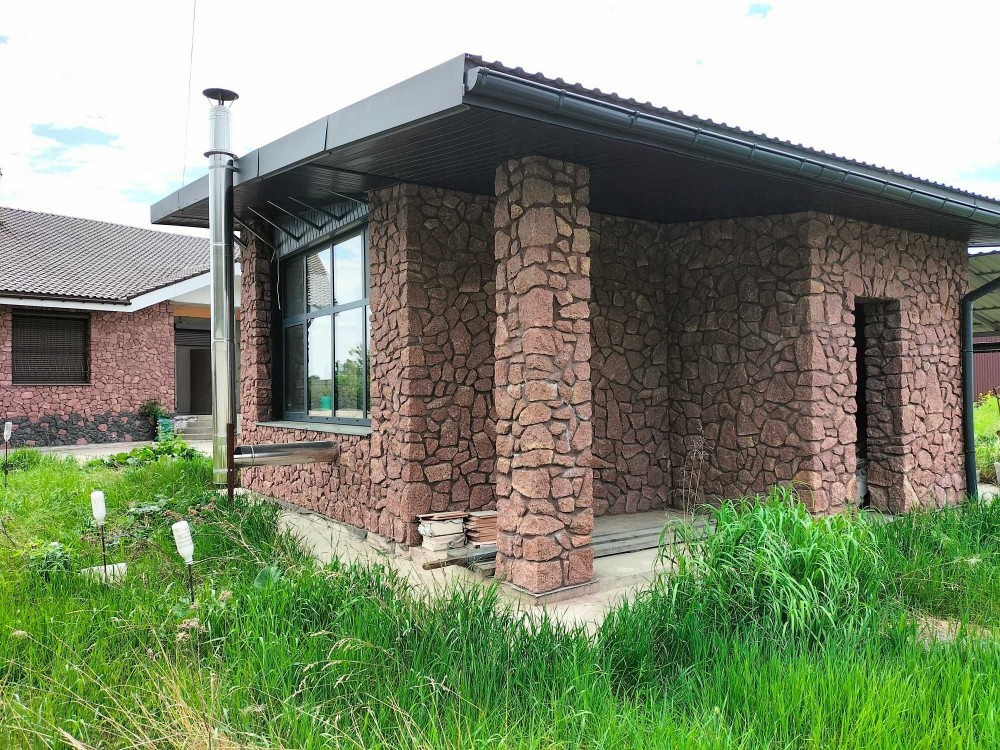 Стіни блок, утеплені. Додатково зовнішнє оздоблення та зміцнення стін "диким (природним) червоним каменем" з Лозинського кар’єру, та лабрадоритом з Очеретяне.