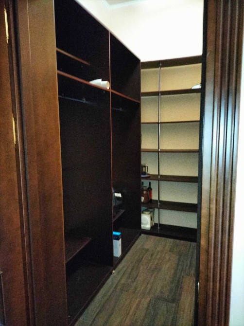 У спальні велике ліжко та шафи з натурального дерева.