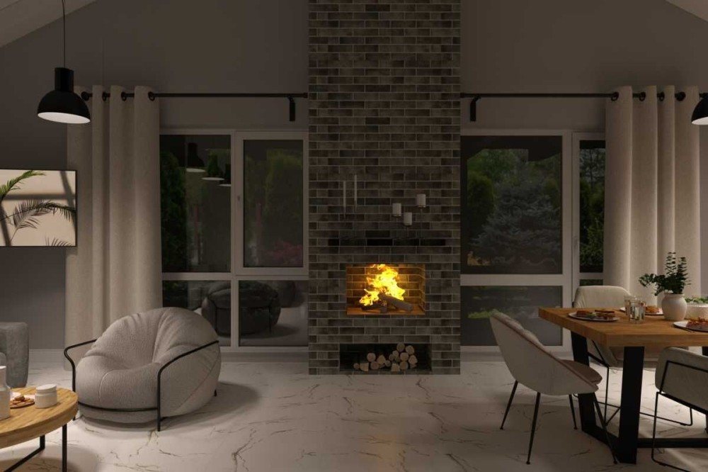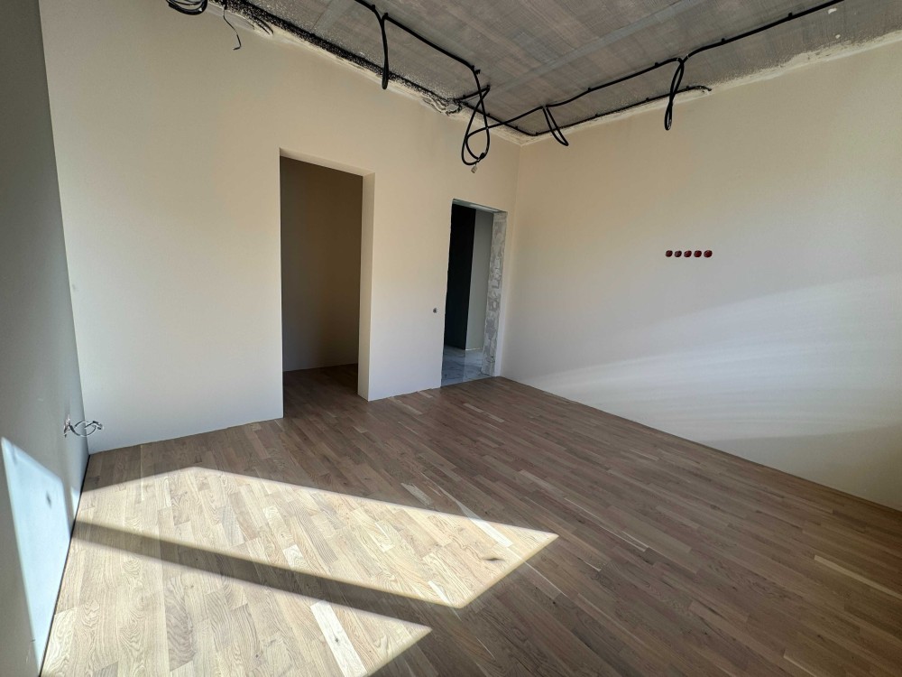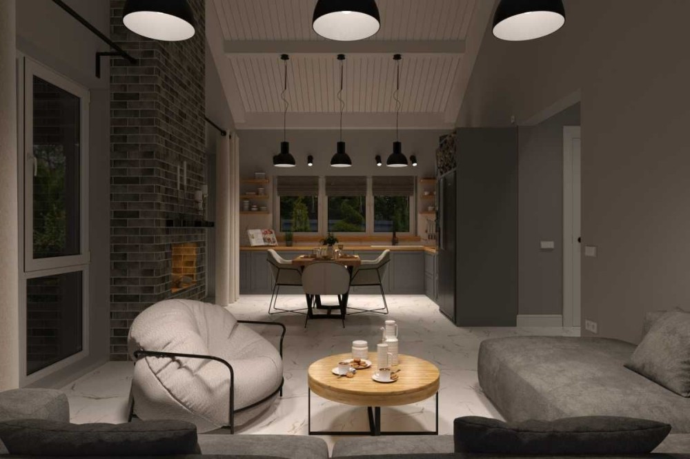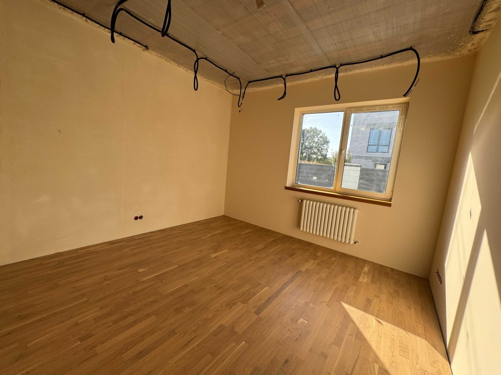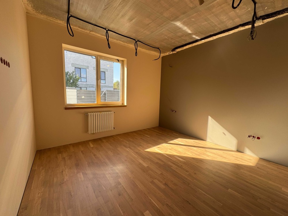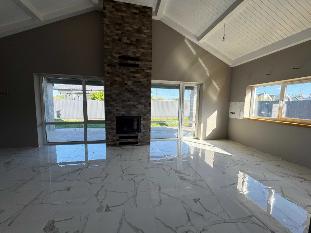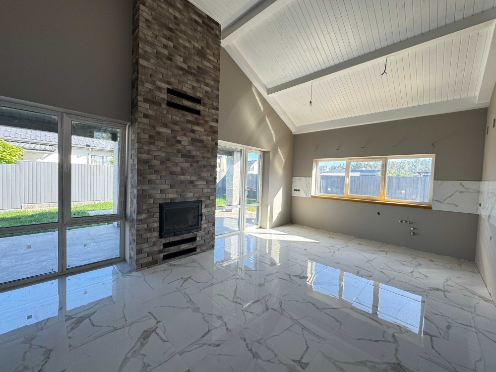 Планування зручне та просторе: велика кухня-вітальня з виходом на терасу, каміном і високими стелями, три окремі кімнати, гардеробна, санвузол, технічне приміщення та коридор. В усіх кімнатах на підлозі покладена дубова паркетна дошка, що додає інтер’єру стилю та теплоти. Камін підготовлений до використання: є топка, вивід димоходу, декоративна плитка під цеглу та вогнестійке оздоблення.