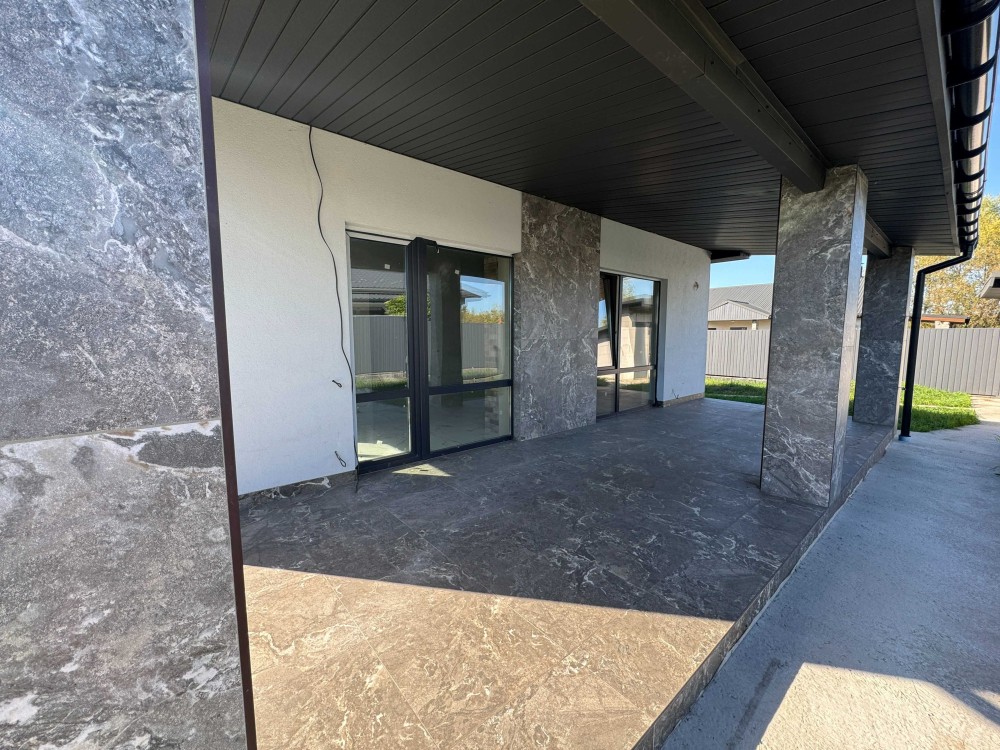 Будівля зведена з якісних матеріалів. Стіни виконані з газоблоку Стоунлайт, утеплені пінопластом. Фундамент – армований бетон, залитий у кілька етапів з гідроізоляцією та водовідводом у септик. Дах покритий італійською металочерепицею, під нею гідроізоляція та утеплення мінеральною ватою,