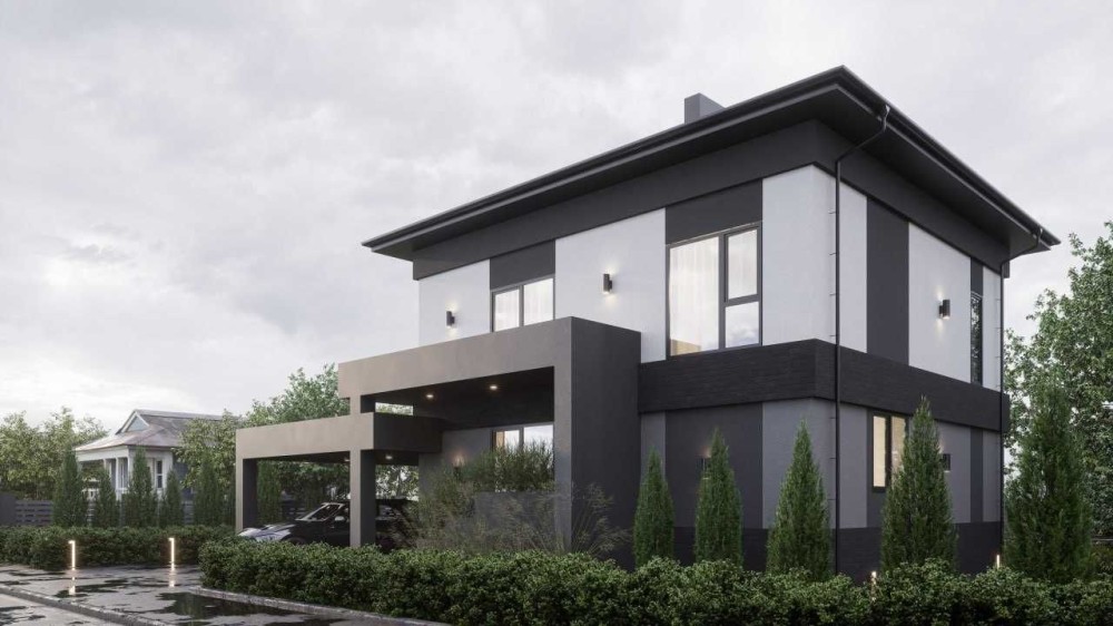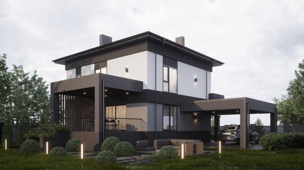 9. Планування: велика вітальня з кухнею-столовою та великими вікнами та дверима на заплановані терасу та виранду; санвузол на першому поверсі; невеличкий, але комфортний кабінет на першому поверсі; технічна кімната на першому поверсі; 2 просторих дитячі на другому поверсі; простора спальня з гардеробною на другому поверсі; великий санвузол+ванна+душова на другому поверсі; окрема гардеробна на другому поверсі
