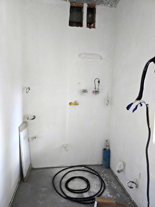 Виконані чорнові роботи: розведена електрика та сантехніка, тепла підлога, чистова штукатурка стін.