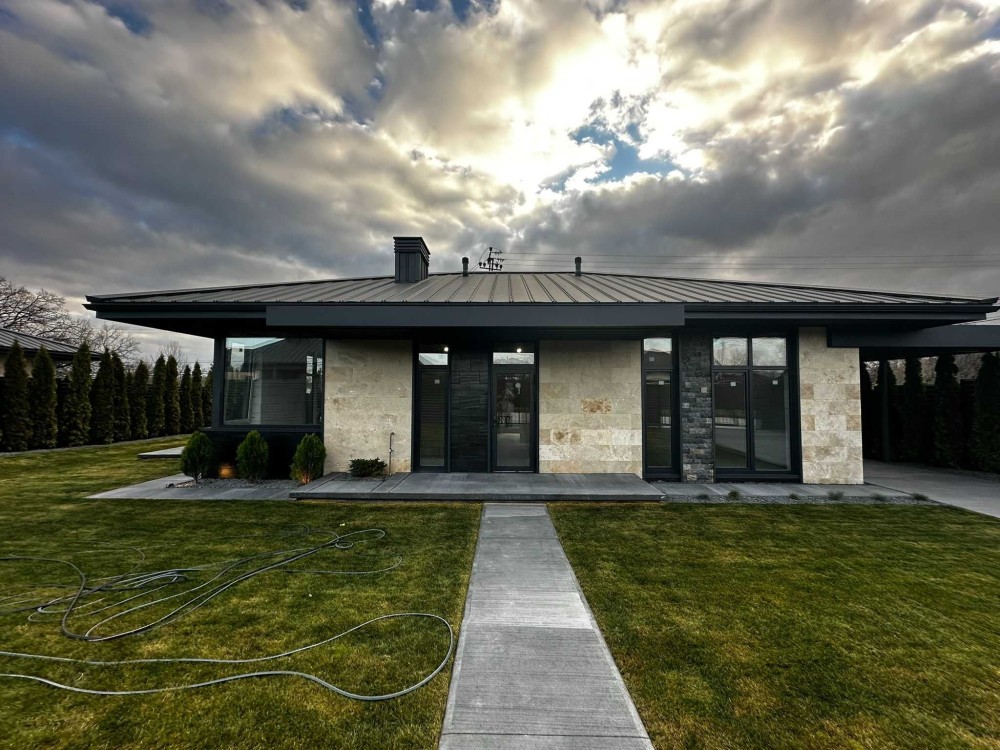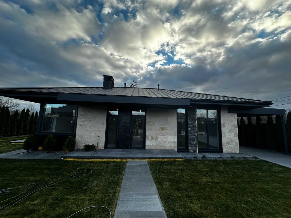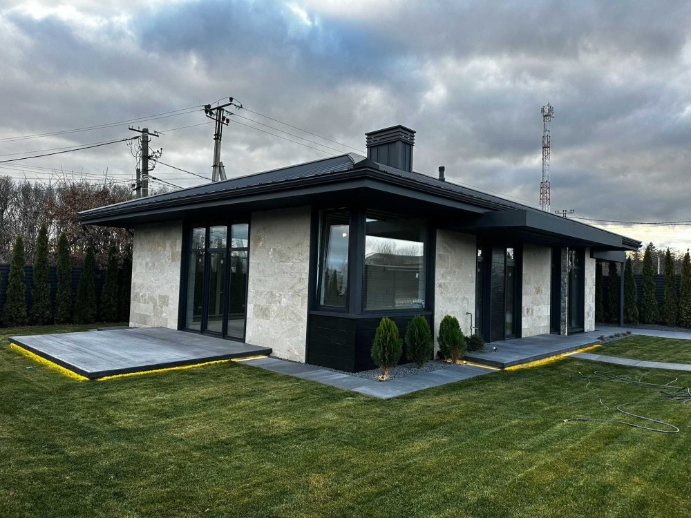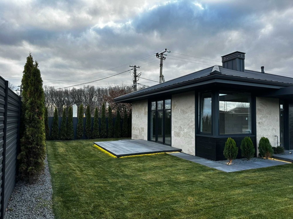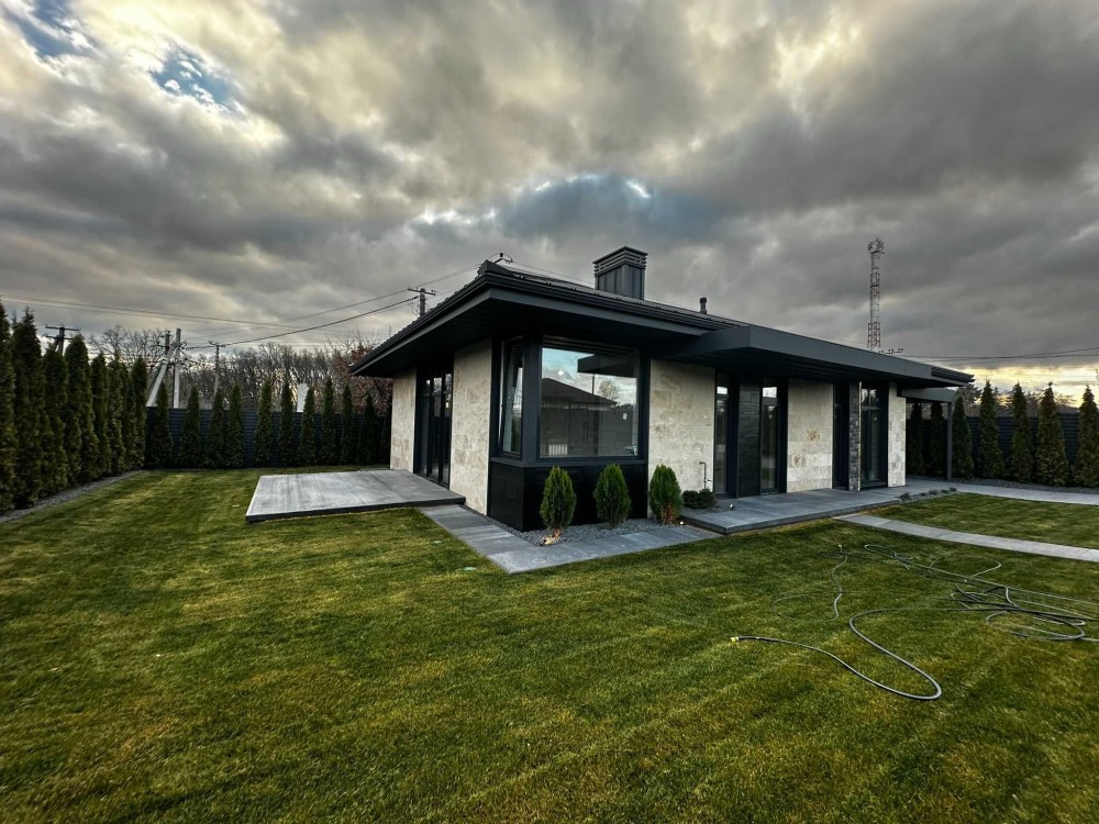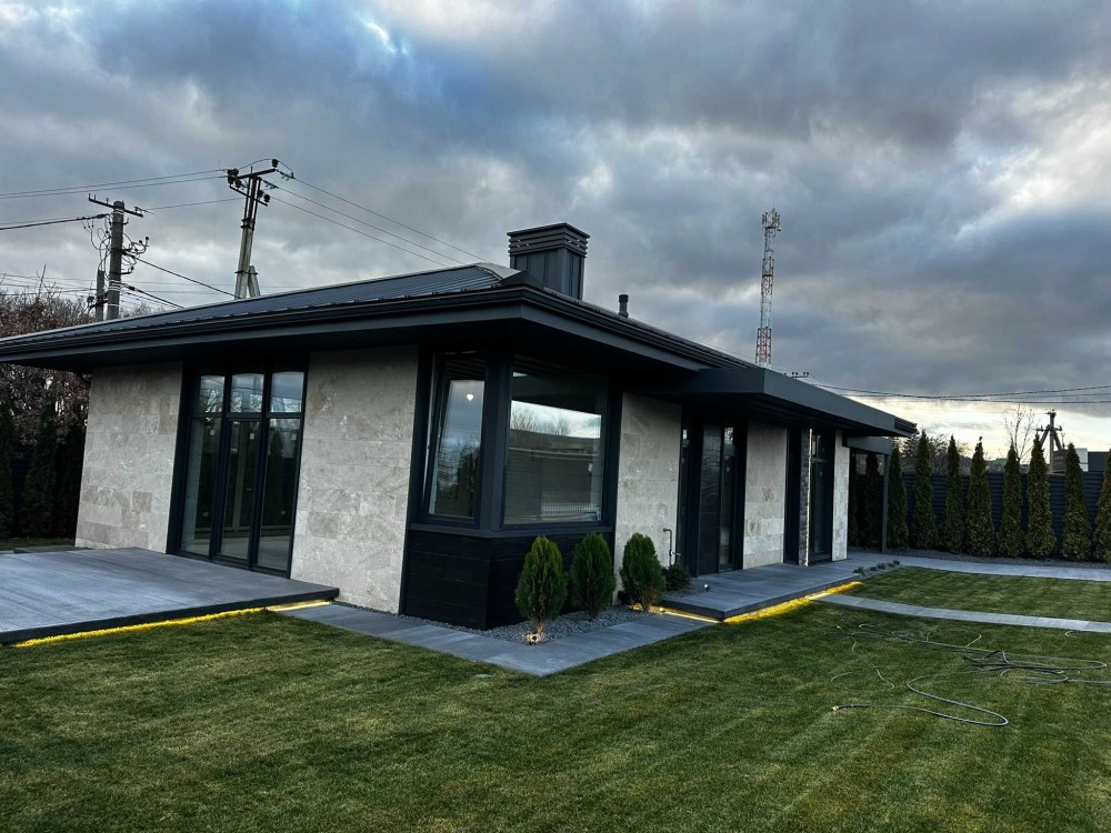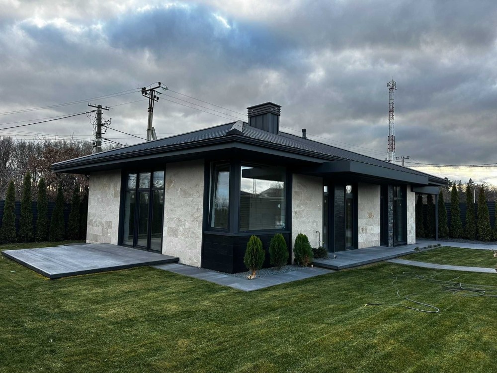 Продається сучасний одноповерховий будинок з фасадом із натурального травертину на рівній ділянці 5 соток.