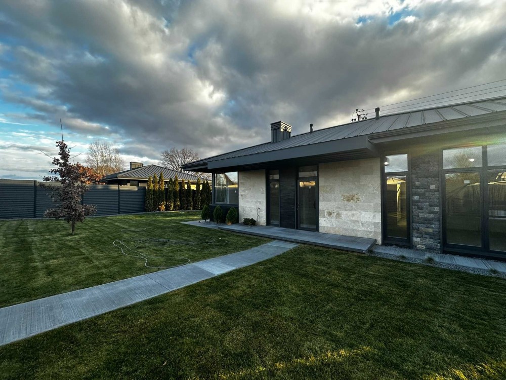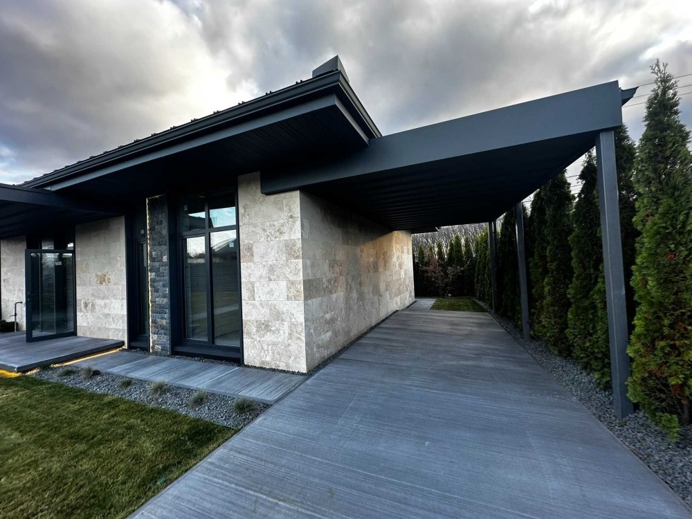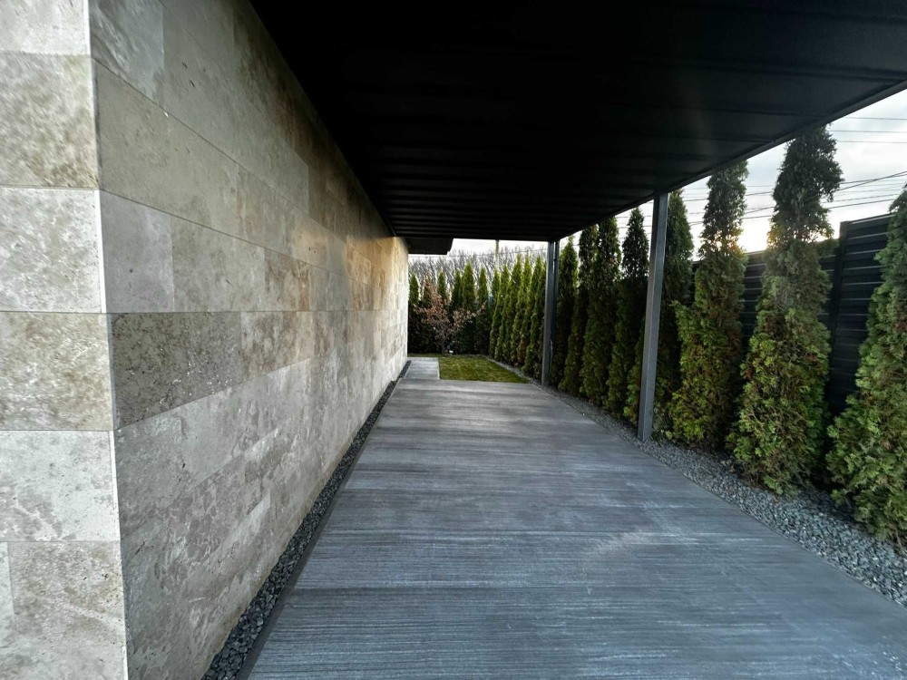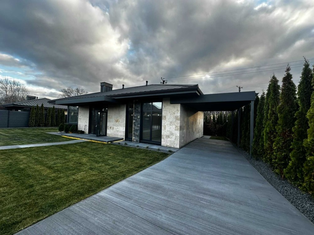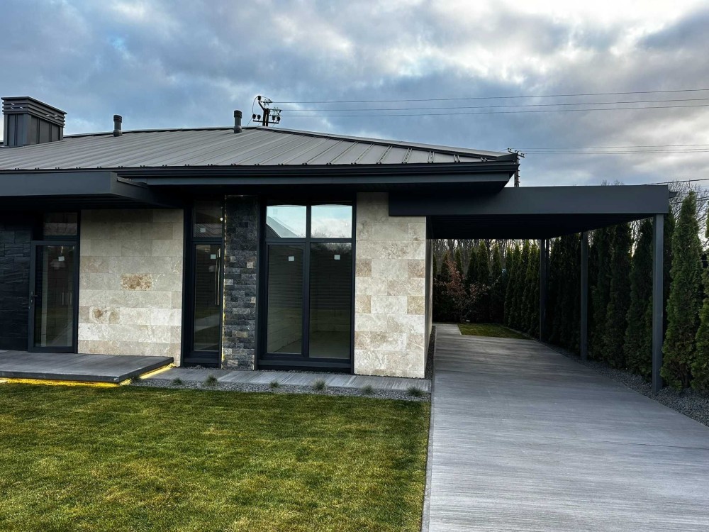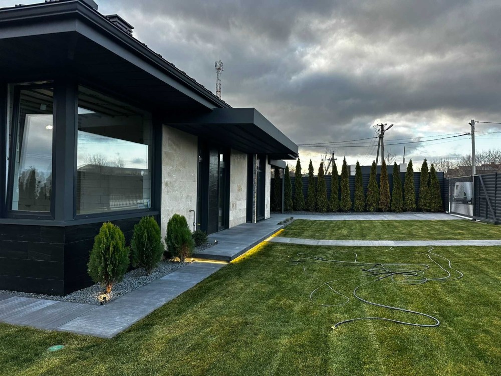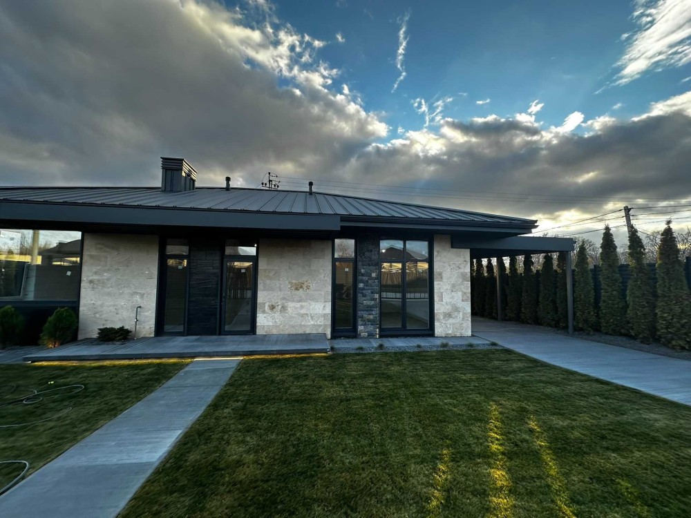 Продається сучасний одноповерховий будинок з фасадом із натурального травертину на рівній ділянці 5 соток.