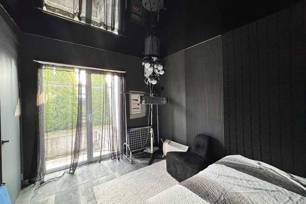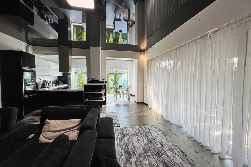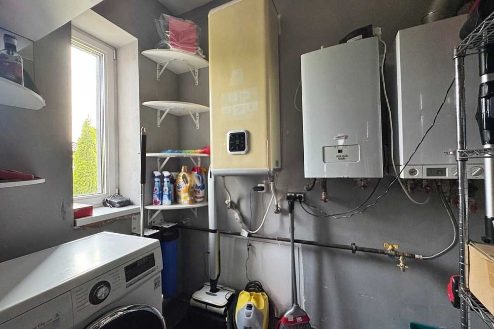 - на першому рівні санвузол,котельня з технічною складовою по будинку, де знаходиться електричний котел, двоконтурний котел,бойлер, фільтрація води, гребінка теплої підлоги і.тд. та простора кухня-вітальня, зонована на зону відпочинку та зону приготування.