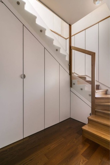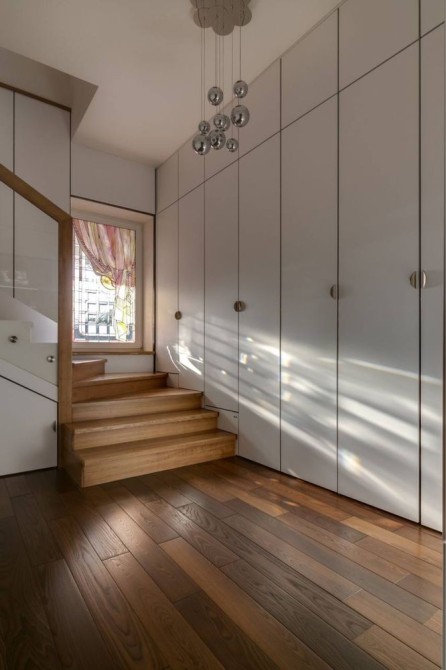 Інтер’єри всіх приміщень у будинку спроєктовані за принципом еко-мінімалізму. Основним матеріалом в оздобленні стали шпоновані панелі з горіха, дуба та ясеня. Практично все електричне освітлення в кімнатах приховане — для створення спокійної, камерної атмосфери в домі. Безліч вікон і світлопропускних конструкцій, спроєктованих у співпраці зі студією сучасного вітражу KUTNAGLASS, наповнили інтер’єри природним і переломленим, фактурним світлом. Світло з вуличних вікон, заломлюючись крізь скло текстурних вітражів, освітлює вітальню зранку та вдень, а ввечері цю функцію виконує авторська люстра, створена за унікальним ескізом дизайнера будинку Дениса Кутнякова з мінералів гірського кришталю, гранованих фацетів і вітражного скла.
