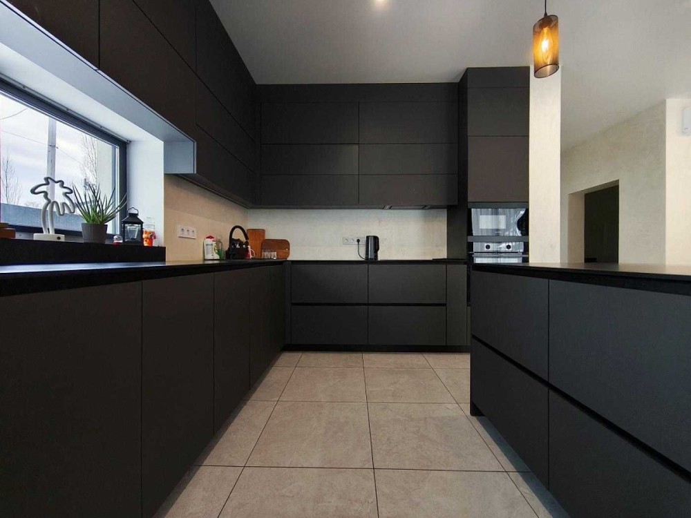 Сучасна кухня з вбудованою ПММ, духовою шафою, мікрохвильовкою і холодильником side by side.