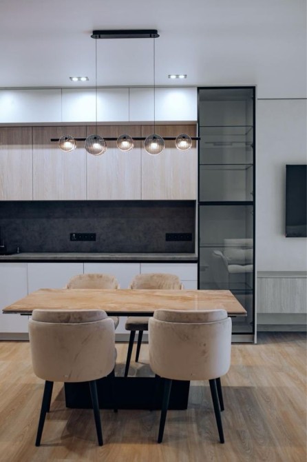Повністю укомплектована кухня та техніка: духовка, мікрохвильова піч, посудомийка, холодильник, плита.