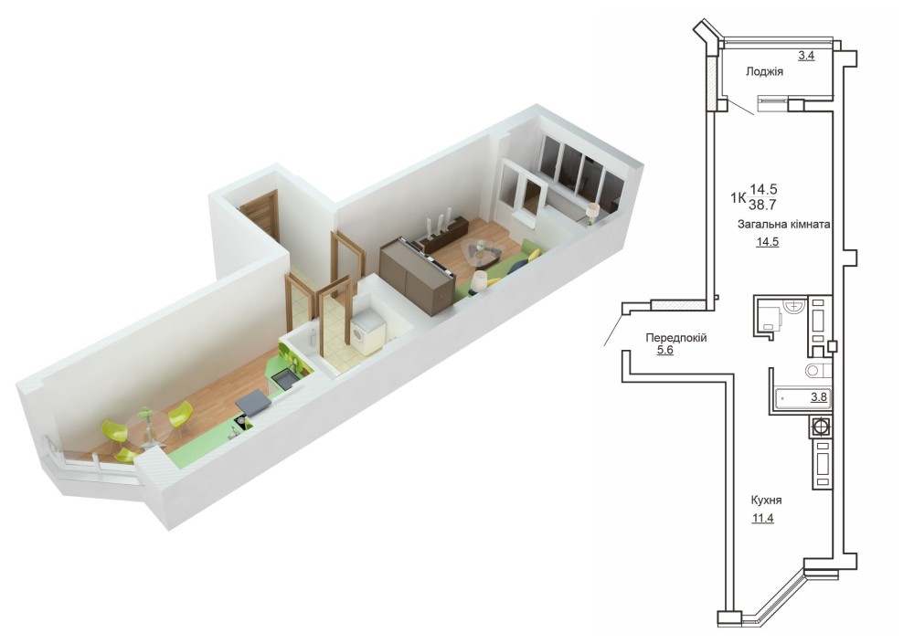 • Площа кухні 11.4 м2
