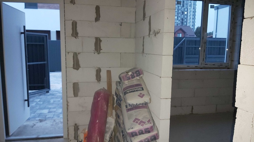 Стіни: газоблок утеплений мінеральною ватою.