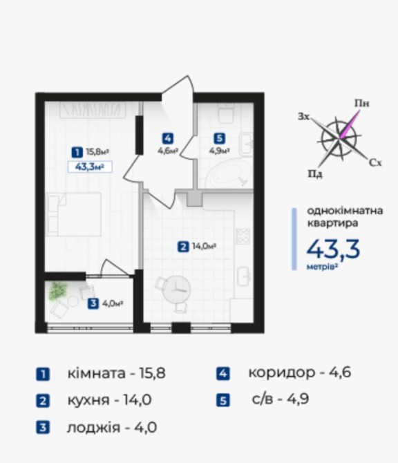 • Загальна площа 43.3 м2