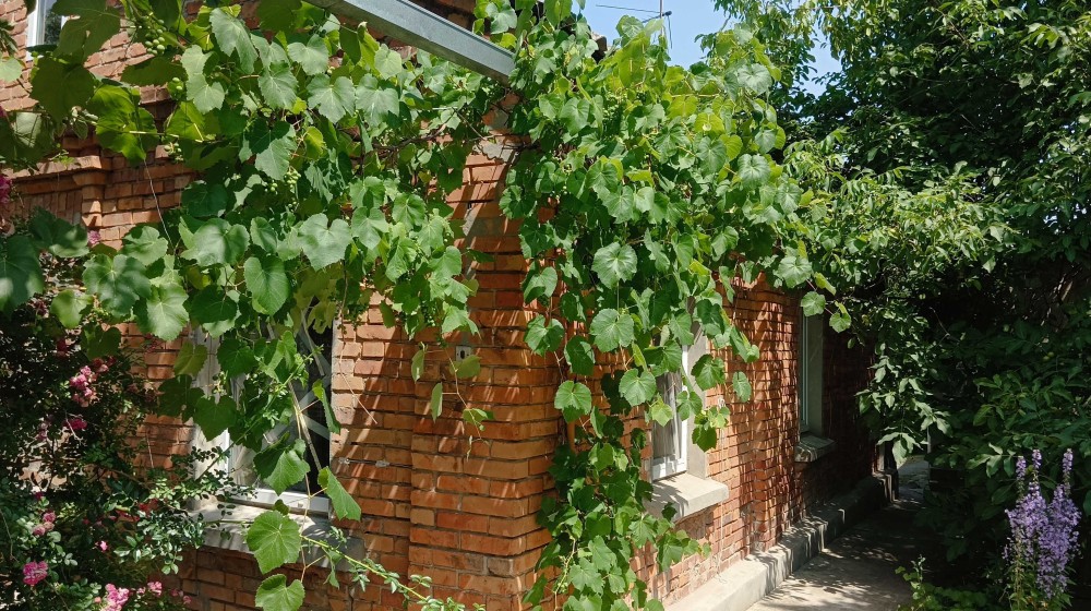 Участок 5 соток ровный с декоративными кустарниками и плодовыми деревьями.