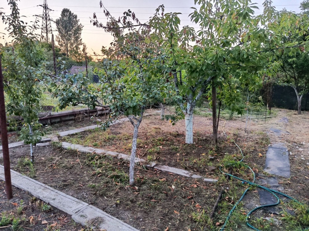 Черешня 1 ши сливы 2 шт 2 груши ,1 абрикоса , крыжовник , ежевика , клубника , винограда , все на участке по периметру забор , туалет душ ,баки под воду ,дровник есть. Вопросы задавайте
