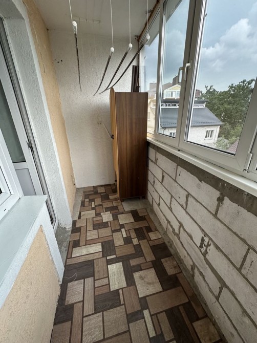 Кухня з заселеним балконом та окрема житлова кімната з кондиціонером.