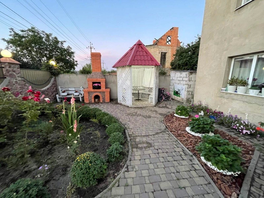 За будинком — затишний двір із альтанкою, виноградною аркою та молодим фруктовим садом.