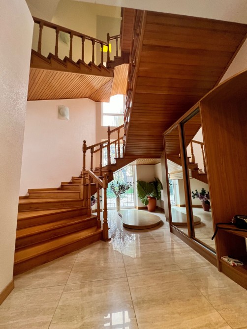 Планировка и интерьер: 1-й этаж: просторная гостиная с панорамным видом на сад, сауна, санузел с душевой. 2-й этаж: винтовая деревянная лестница выводит в зону отдыха — уютный каминный зал и гостиная с комфортными диванами и видом на сад. Здесь же — полностью оборудованная кухня с профессиональной техникой, выход на террасу и ванная комната. 3-й этаж: спальня с выходом на террасу, детская и гостевая комнаты, большая ванная с джакузи.