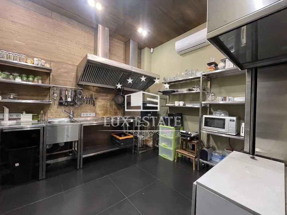 На территории дома расположен домик с панорамным остеклением, оборудованной кухней и мебелью,