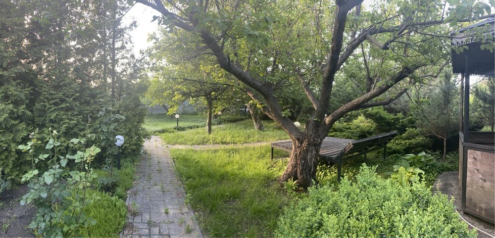 Большая территория,огражденная высоким забором ,беседка,колодец