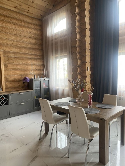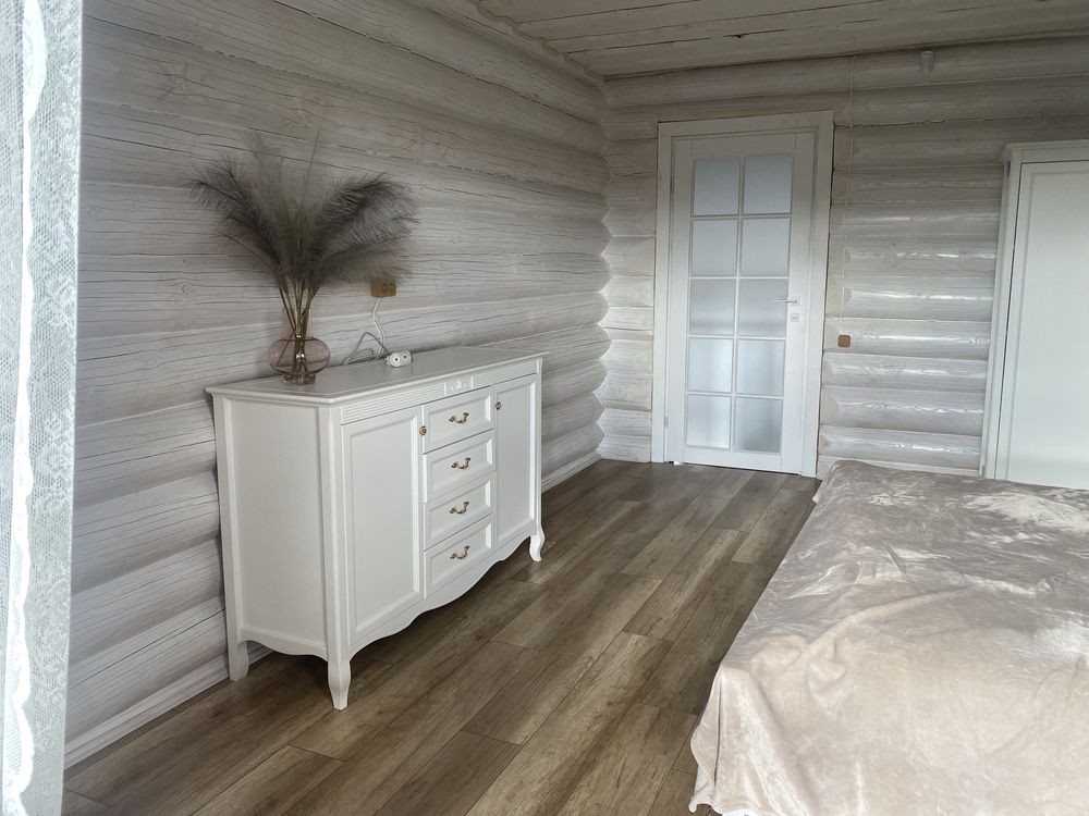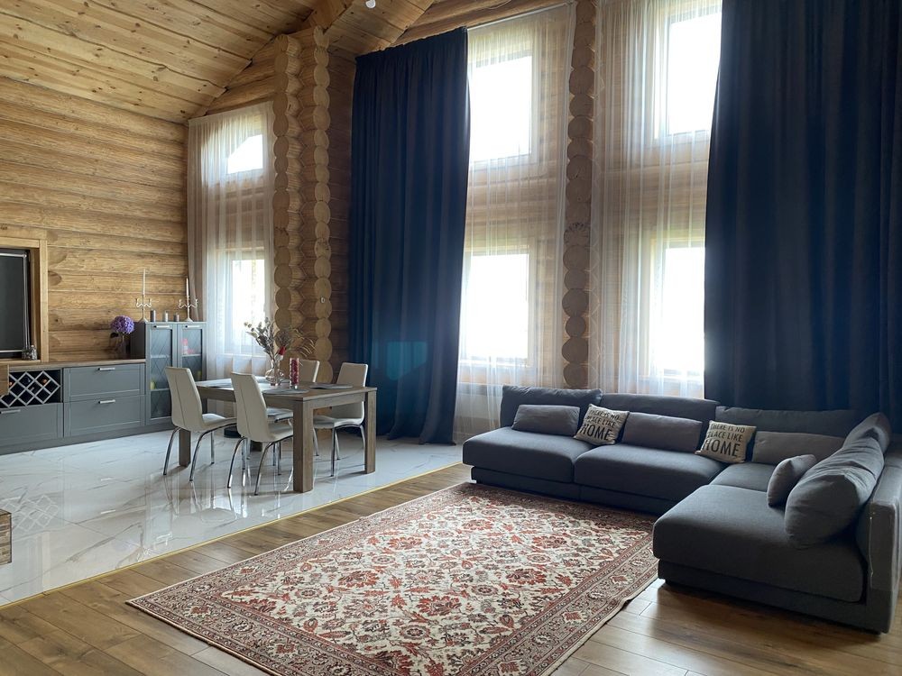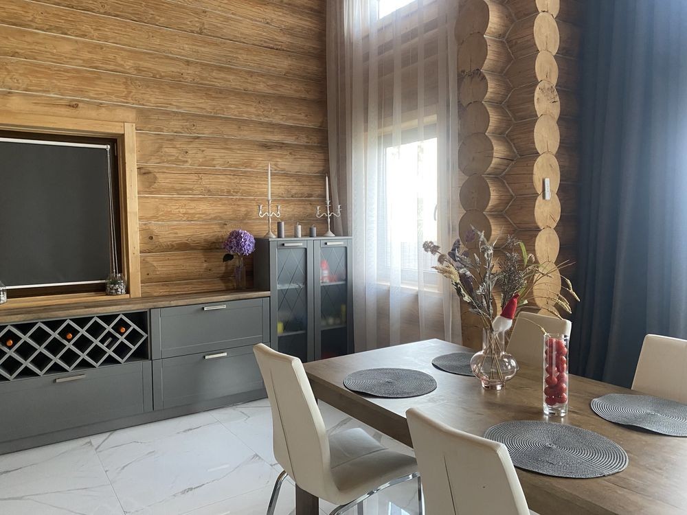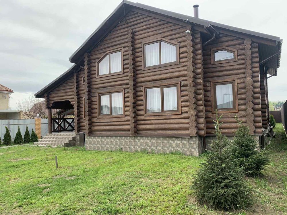 Двоповерховий 5-кімнатний будинок (262 м2) в с.Тарасівка в 10км від Києва по Одесській трасі 1-й поверх: великий хол з каміном сумісний з кухнею, дві спальні кімнати та санвузол з душем, вхід в баню на дровах 2-й поверх: дві спальні кімнати, санвузол з ванною та балкон Будинок повністю облаштований усім необхідним для проживання: - Посуда - Постільна білизна - Робот пилосос - Праска - Сушка - Гладильна доска - Мікрохвильовка - Посудомийна машина - Підігрів підлоги - Бойлери - Обігрівачі - Мангал та все необхідне для нього Опалення: В холі будинку є дровяний камін / піч, який обігріває весь будинок. В пристройці є запас дров на зиму.В будинку 3 бойлери та 5 електричних обігрівачів, а також підігрів підлоги. Комунальні (тільки електрика): При ввімкнених обігрівачах та підігріву підлоги без каміну - ~1500 грн. взимку Є два генератори: на 3.5 кВт та на 5.5 кВт В будинку встановлена сигналізація ШЕРИФ, камери відеонагляду можна переглядати з телефону У вартість оренди входить замовлення клінінгової компанії один раз на місяць. Будинок побудований з відбірного дикого зрубу товщиною 40 см. Є скважина з фільтром, а також встановлений окремий фільтр для питної води. Від Києва до будинку всюди прокладений асфальт, зручно добиратись на автомобілі. Поряд є заправки OKKO. Є також навіс біля будинку для 3-х машин. На території є зарядка для електрокара. В 100 метрах від будинку знаходиться КМ «Green Hills», де є салон краси, спорт зал, спа, бассейн, минимаркет, садочок, школи. Також поряд декілька дитячих садкіів. В 10-ти хвилинах на машині знаходиться великий NOVUS