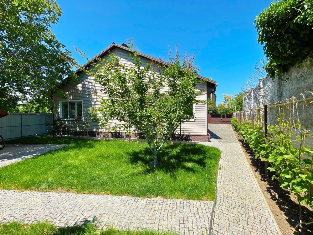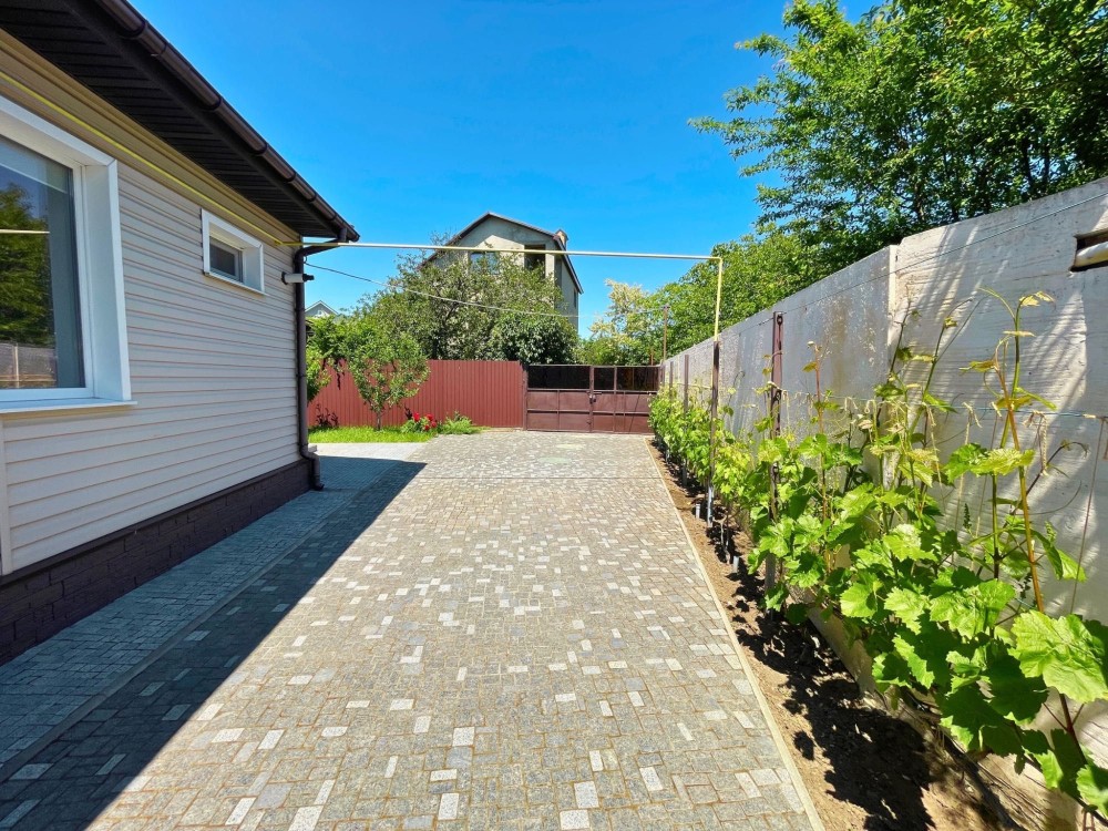 Также на территории есть виноградник, фруктовый сад и вольер для домашнего питомца. Двор и дорожки выложены натуральным гранитом.