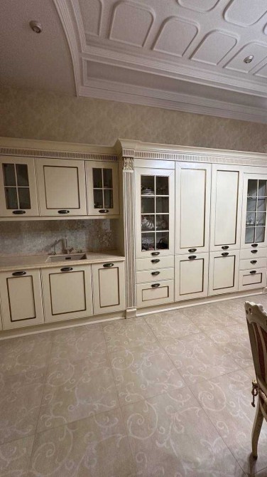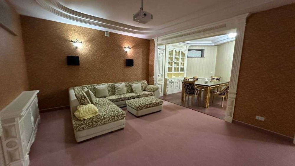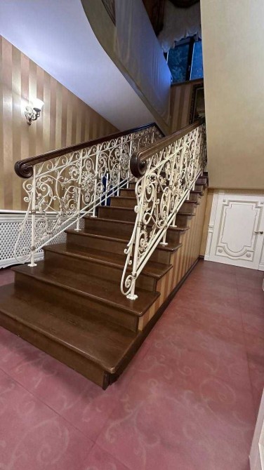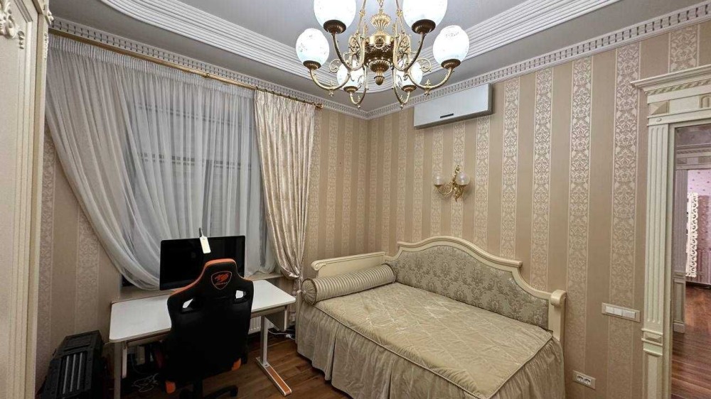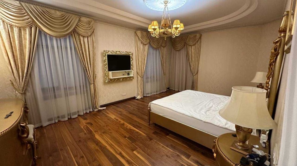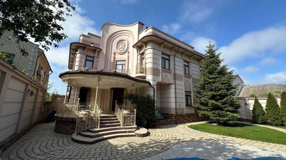 Трехуровневый шедевр архитектуры с общей площадью 700 м расположен на участке 10 соток. В доме — гараж на два авто, бассейн, летний домик для отдыха, две кухни, детская игровая, домашний кинотеатр, баня и хамам. Интерьер выполнен с душой: мозаичная отделка, ручная лепнина, кованая лестница под заказ, эксклюзивные люстры, витражные двери.