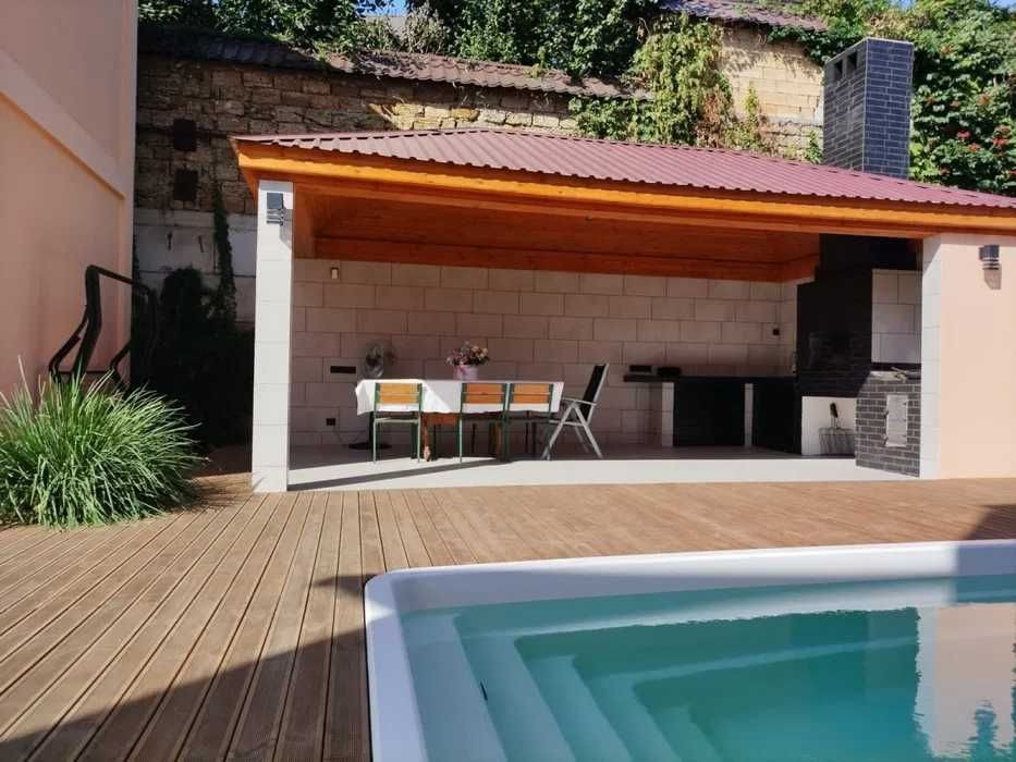 Продам будинок у Чорноморці, територія 4.5 сотки (20*22,5). Три паркомісця: два під навісом, одне перед будинком. На території двоповерховий будинок 108,5, метрів (на першому поверсі зал, кухня, суміщений туалет з ванною, гараж на одне паркове місце. На другому - три спальні та робочий кабінет); окрема баня 7*4 (перший поверх кухня-студія, другий - па місце. На другому - три спальні та робочий кабінет); окрема баня 7*4 (перший поверх кухня-студія, другий - парилка, душова і туалет),; крита альтанка з кухнею та мангалом 6,5*3,6 метра та дерев'яна альтанка 2.30*4.10; басейн 7,5 * 3,5 метра; з терасною дерев'яною дошкою; критий навіс для паркування двох машин 4*10 метрів. Резерв води - бак на дві тонни! Генератор на 5,5 кВ працюючий від магістрального газу. Три кондиціонери, тепла підлога на першому поверсі. Два ролети на автоматі.