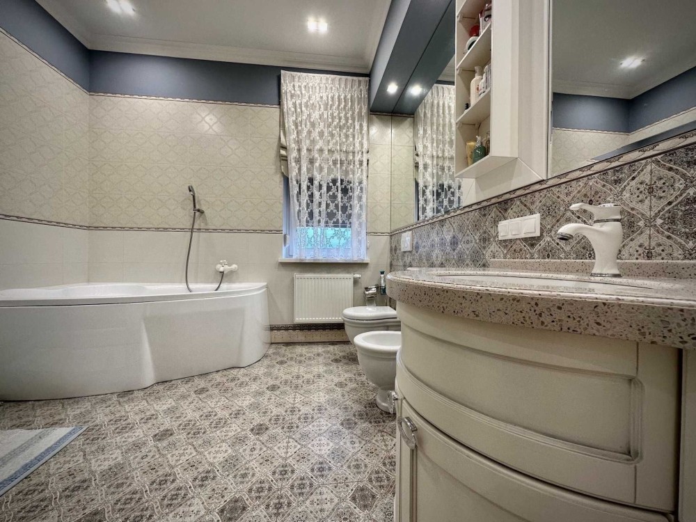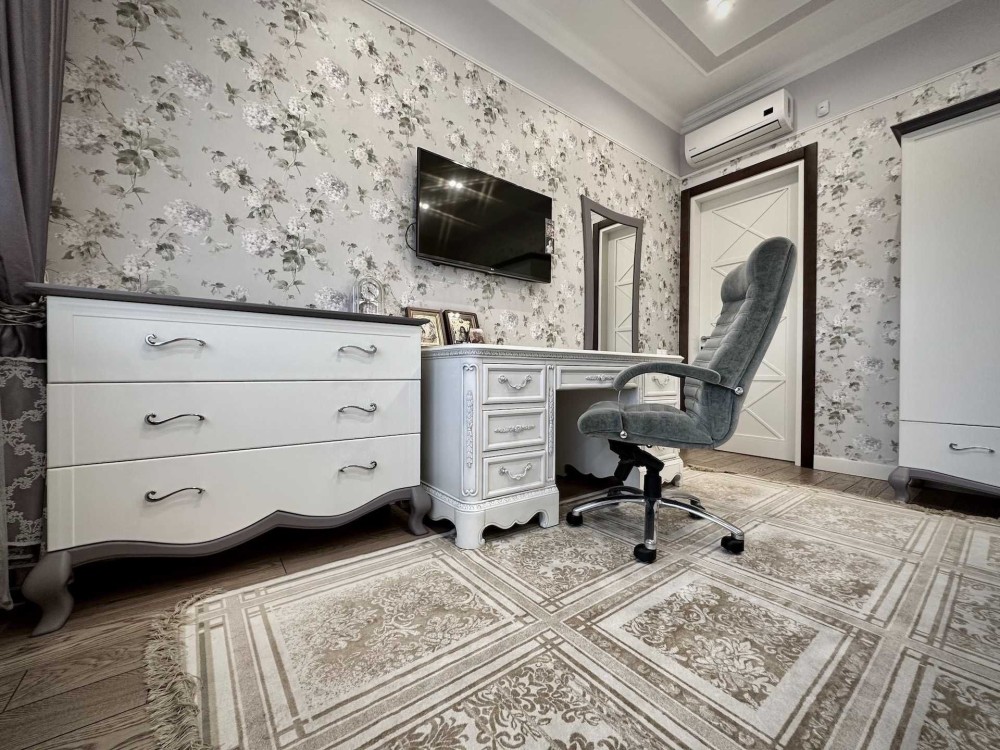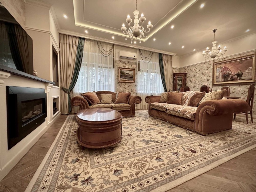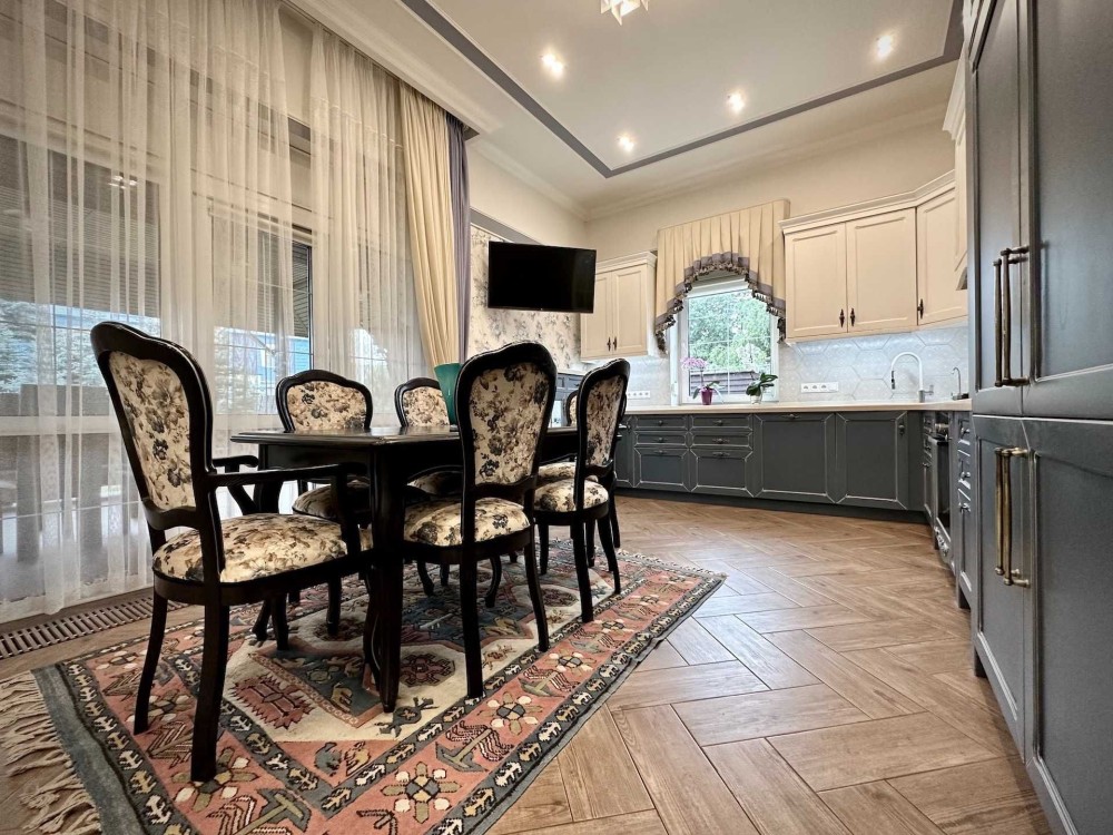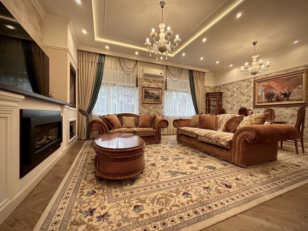 Внутри дома выполнен дизайнерский ремонт с использованием качественных материалов. Все комнаты оборудованы кондиционерами, окна оснащены стеклопакетами REHAU, а также наружными ролетами для вашего комфорта и безопасности. Газовый и электрический котлы обеспечивают тепло, а система сигнализации усиливает ваше чувство безопасности.