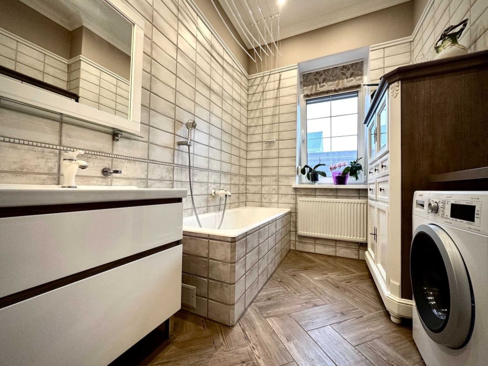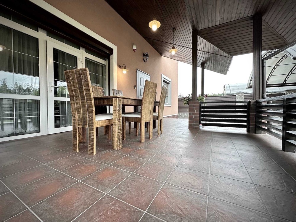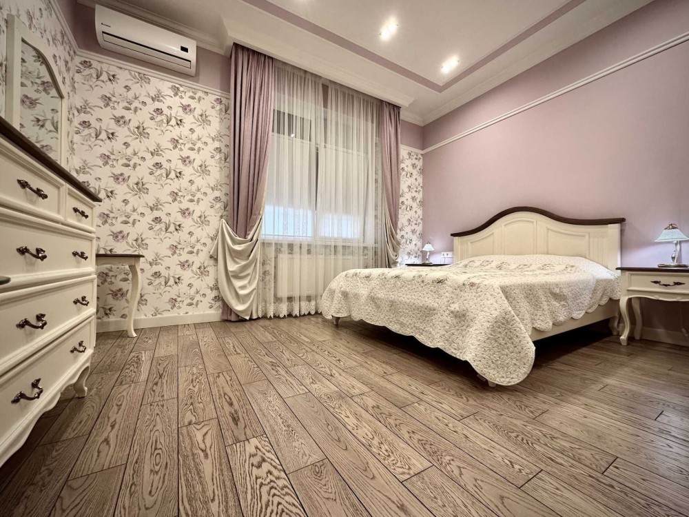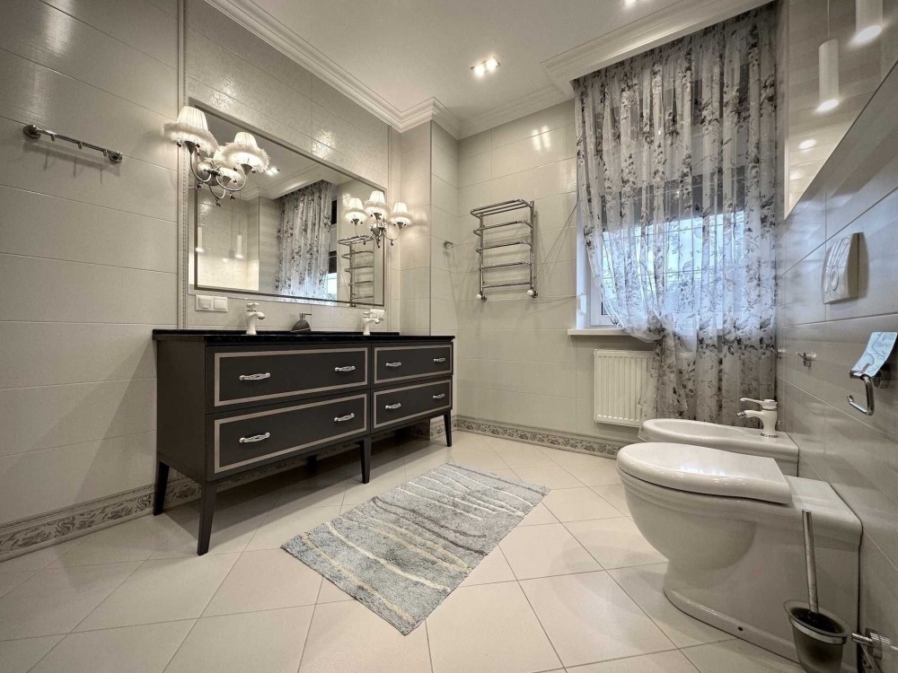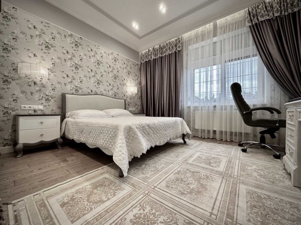 Внутри дома выполнен дизайнерский ремонт с использованием качественных материалов. Все комнаты оборудованы кондиционерами, окна оснащены стеклопакетами REHAU, а также наружными ролетами для вашего комфорта и безопасности. Газовый и электрический котлы обеспечивают тепло, а система сигнализации усиливает ваше чувство безопасности.