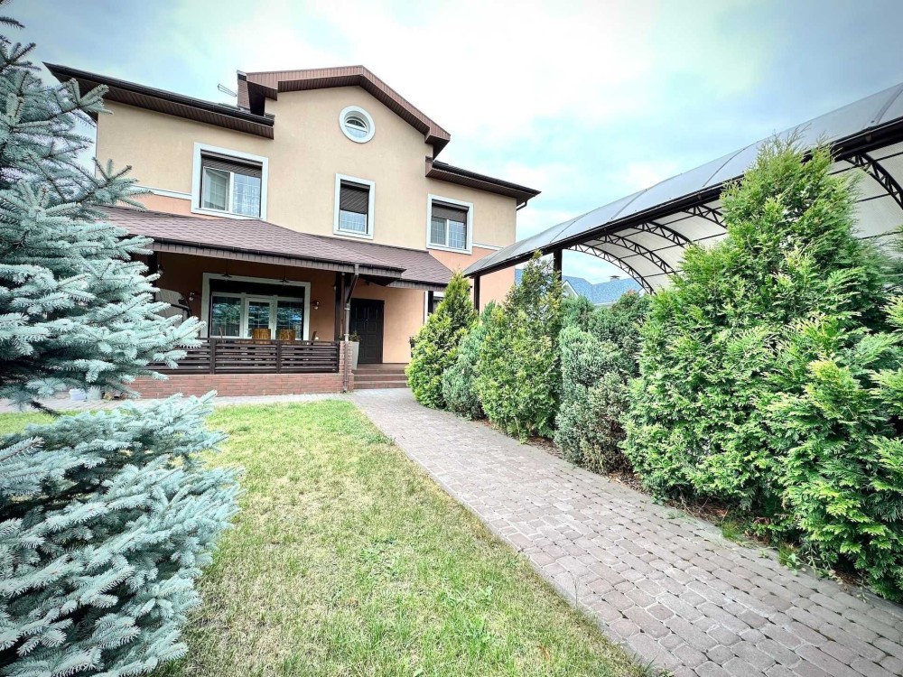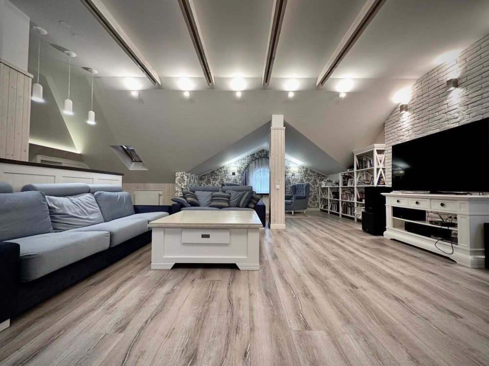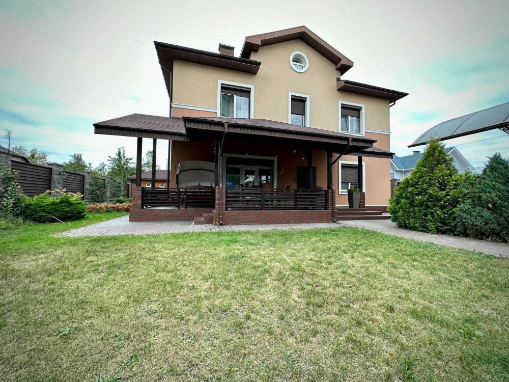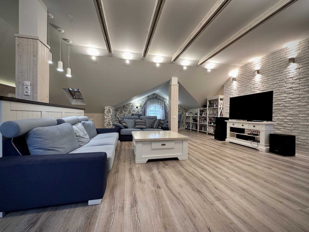 Дом площадью 390 квадратных метров в три этажа. В верхней части дома находится большая мансарда.На втором этаже - просторный холл, три спальни и два санузла.Первый этаж включает в себя кабинет, гостиная-столовая, кухня с выходом на террасу, постирочная, санузел и котельная с выходом в задний двор.