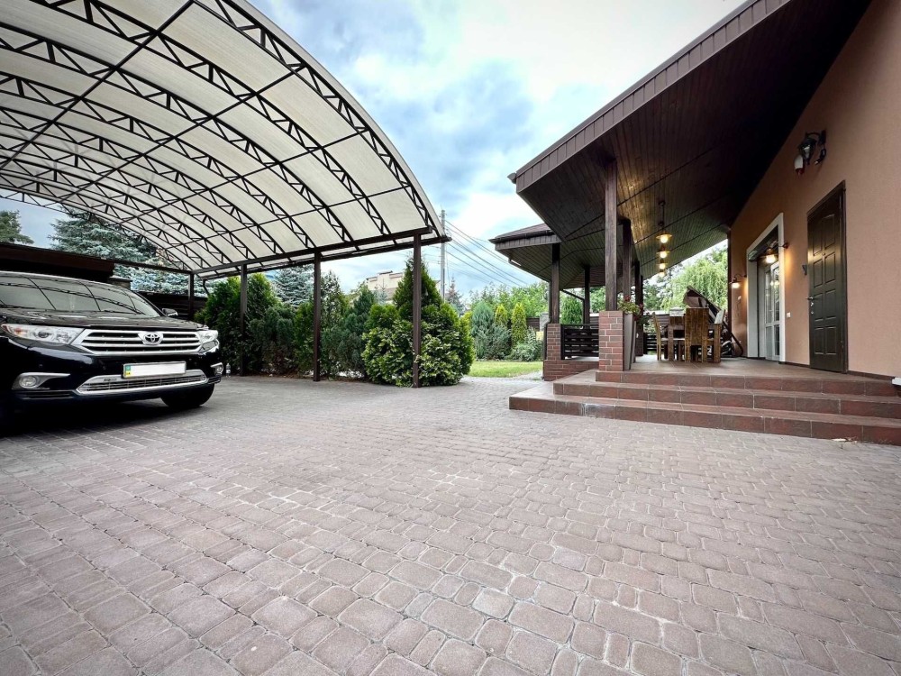 На участке установлен навес для четырех машин и баня площадью 50 квадратных метров. Зеленый газон украшен хвойными деревьями, а наличие скважины гарантирует доступ к чистой воде. Канализация обеспечивается септиком.