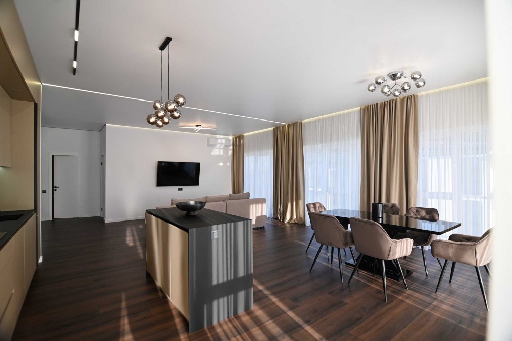 Планування: Простора та світла кімната з великими панорамними вікнами, що наповнює простір природним світлом.