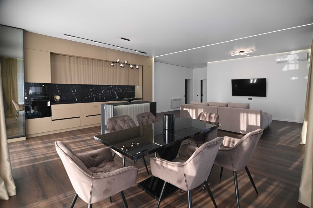 Простора кухня-студія повністю укомплектована меблями та технікою.