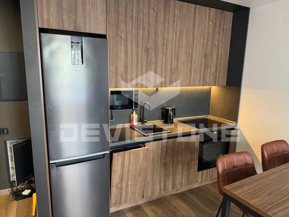 - кухня оздоблена всією необхідною технікою: варильна панель, духова шафа, холодильник, мікрохвильова піч, посудомийна машина, витяжка, кухонний гарнітур, стіл зі стільцями.