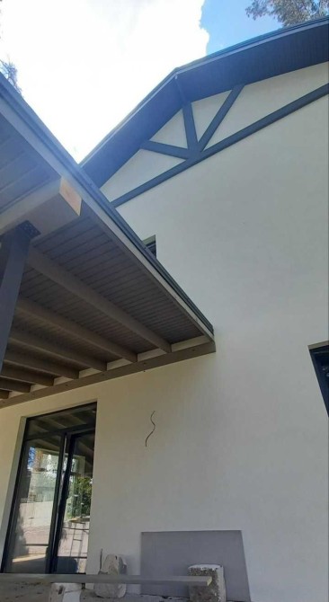 Газобетон, утепление 100 пенопласт, железобетон перекрытия, бетонная лестница, крыша металлочерепица, базальтовая вата, отделка внешняя штукатурка под плитку.