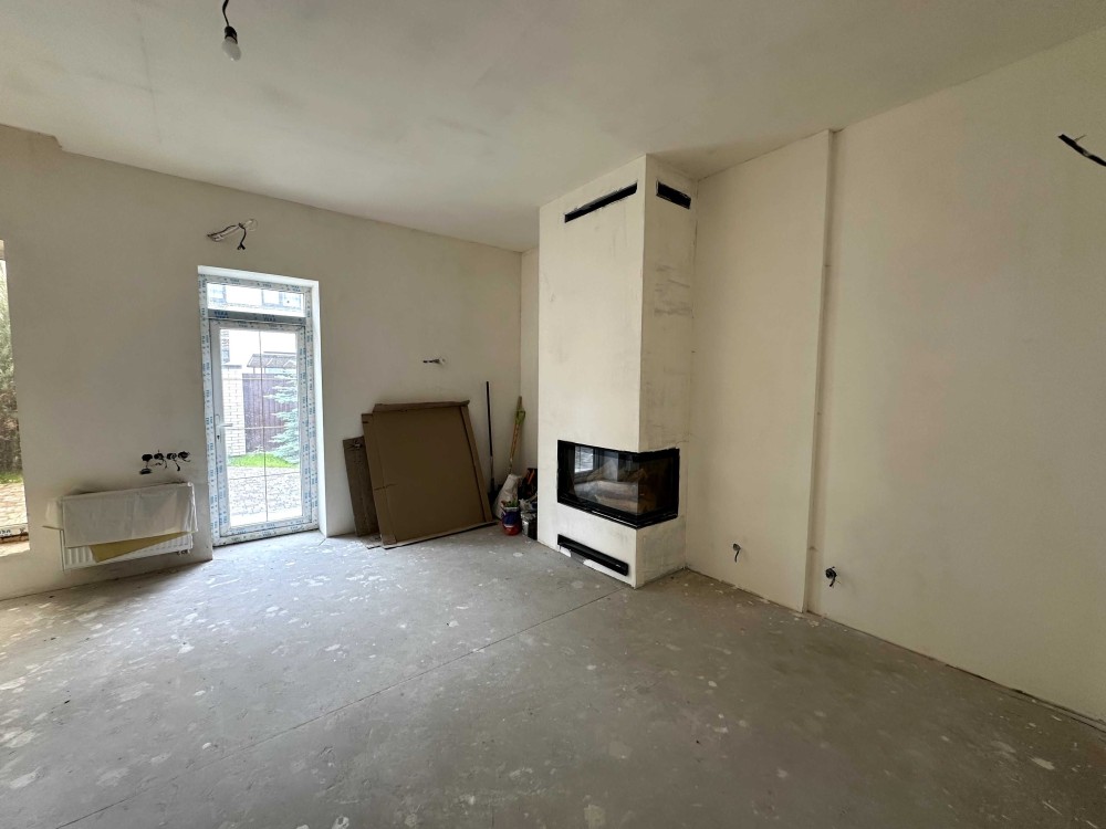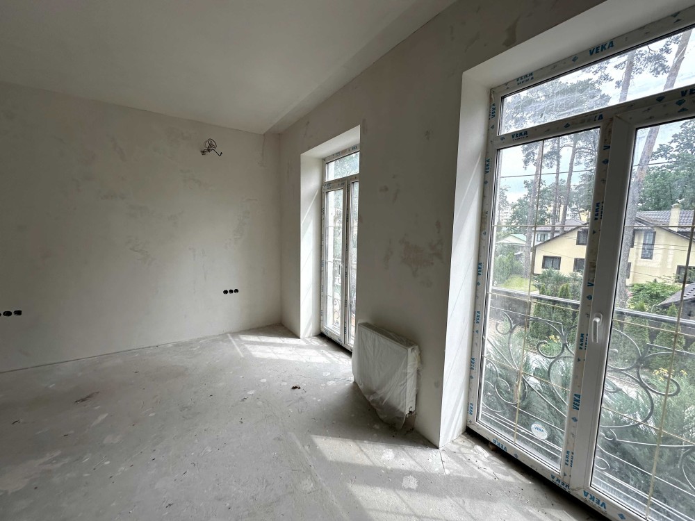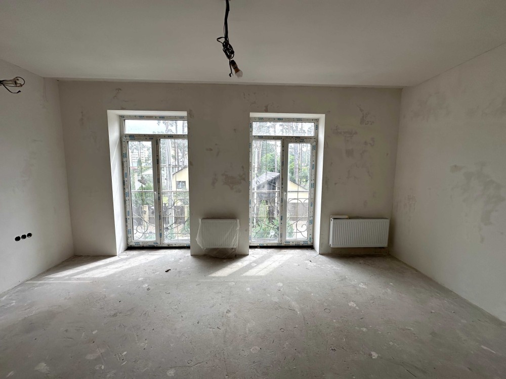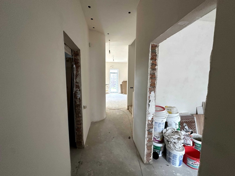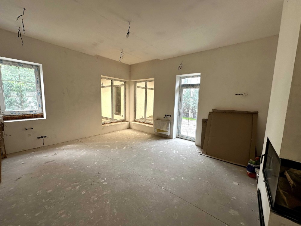 Просторий дуплекс 170 м² на 4 сотках уже з частковим ремонтом і технікою. Тепла підлога, розведена електрика і сантехніка, стіни поштукатурені, в санвузлах — плитка й душові. Є утеплення, шумоізоляція, сигналізація, підняті стелі. Будинок на три поверхи: на першому — кухня-вітальня з виходом у двір, технічна кімната та санвузол; на другому — дві спальні з окремими гардеробами і ванними; на третьому — гостьова, санвузол, пральня і лаунж.