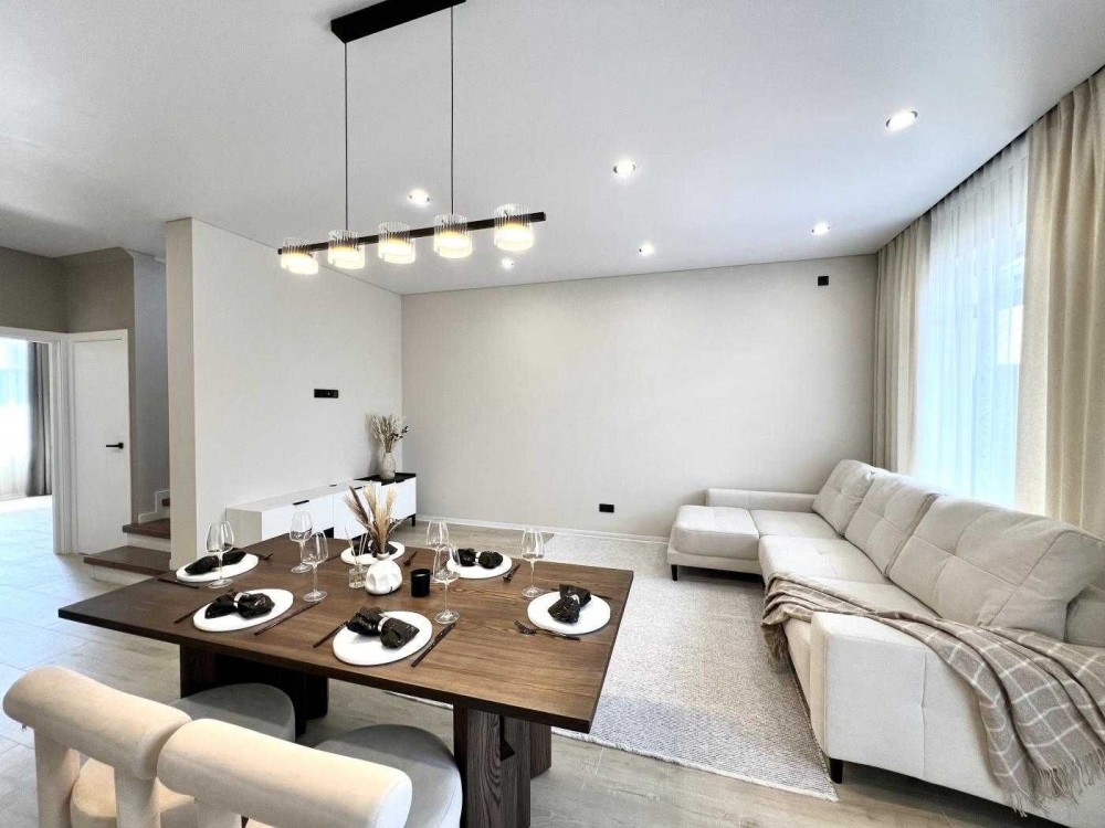 • Вітальня з великим диваном, телевізором та обіднім столом.