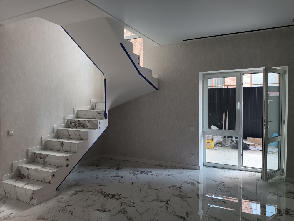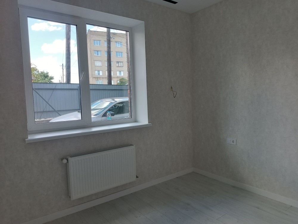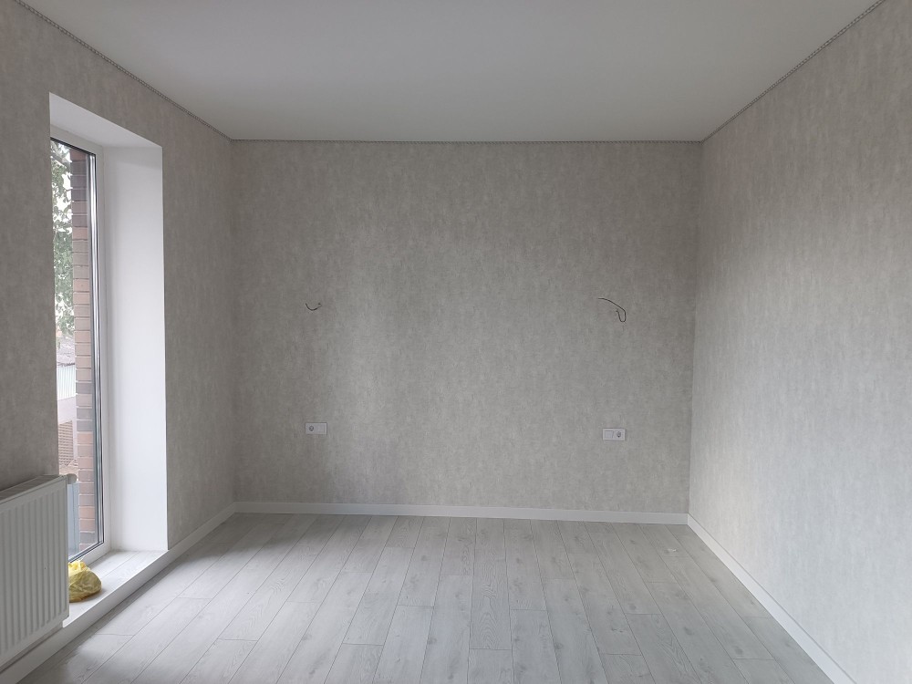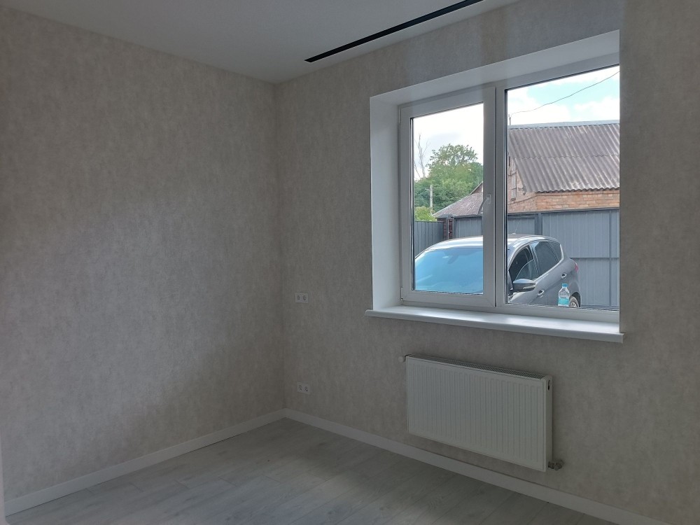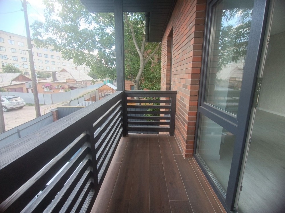 3 роздільних кімнати та велика кухня- вітальня, два санвузла, панорамні вікна, балкон та крита тераса. В дворі виконано благоустрій, по периметру паркан та встановлені відкатні ворота.