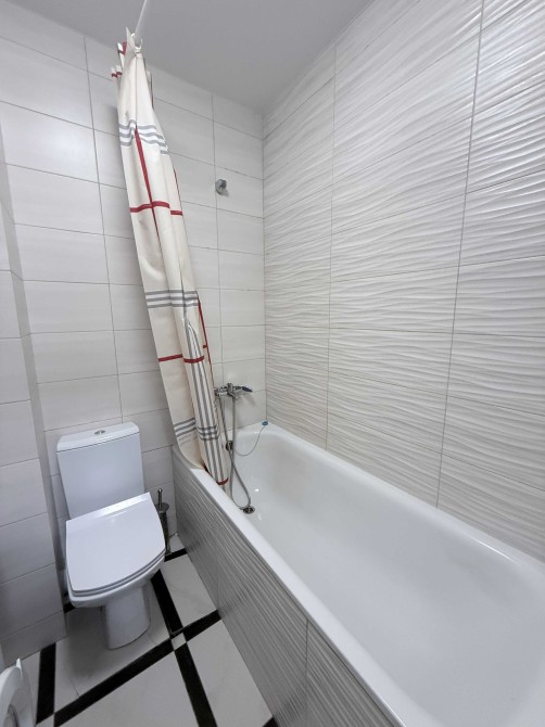 Роздільний санвузол оформлений сучасною плиткою "під мармур". Встановлені тропічний душ та підвісний унітаз з інсталяцією.