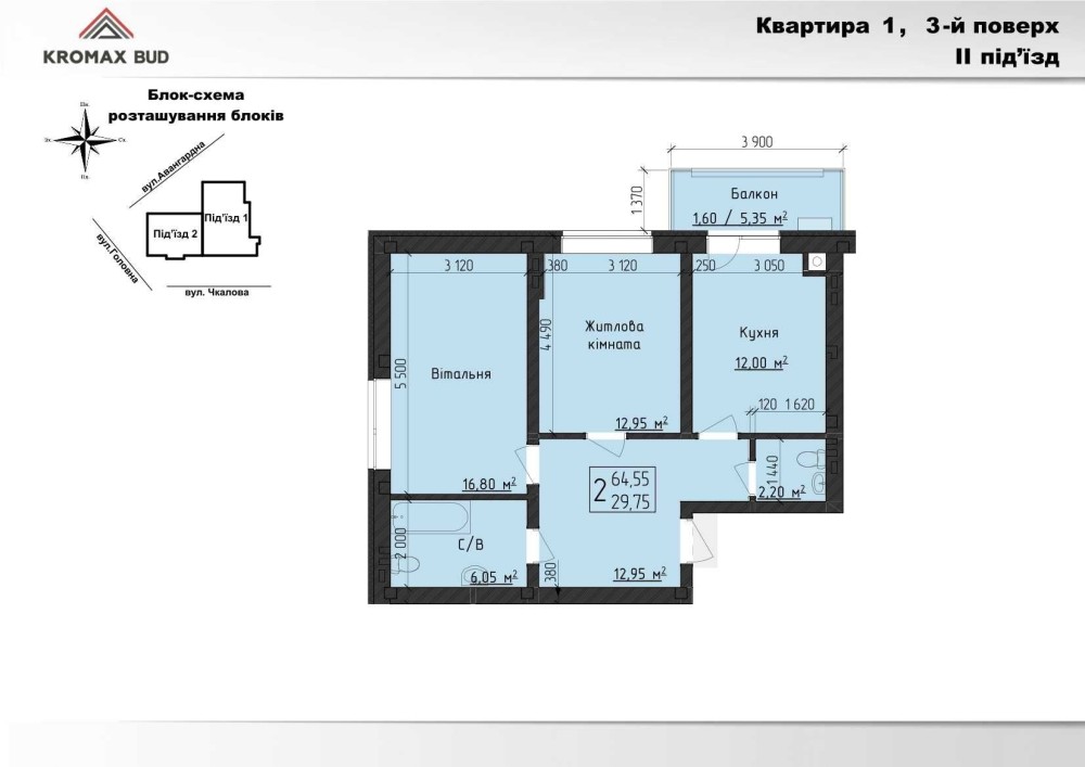 • Загальна площа 64.55 м2