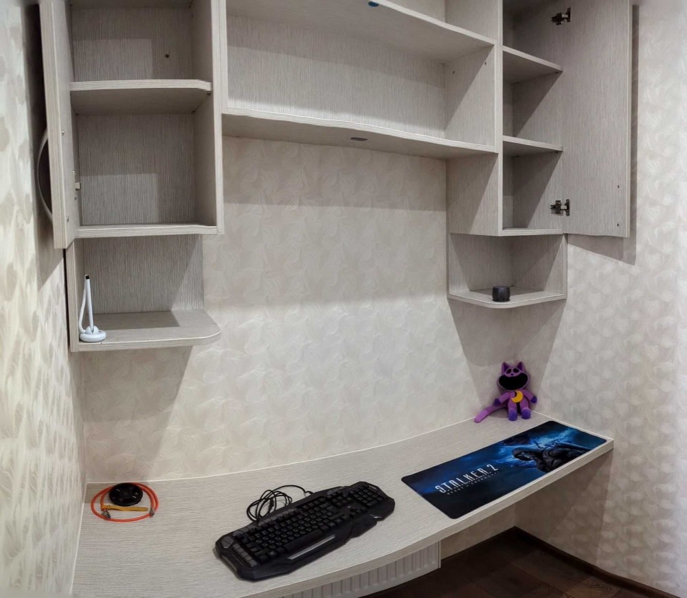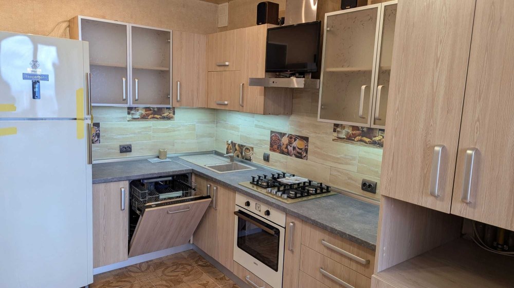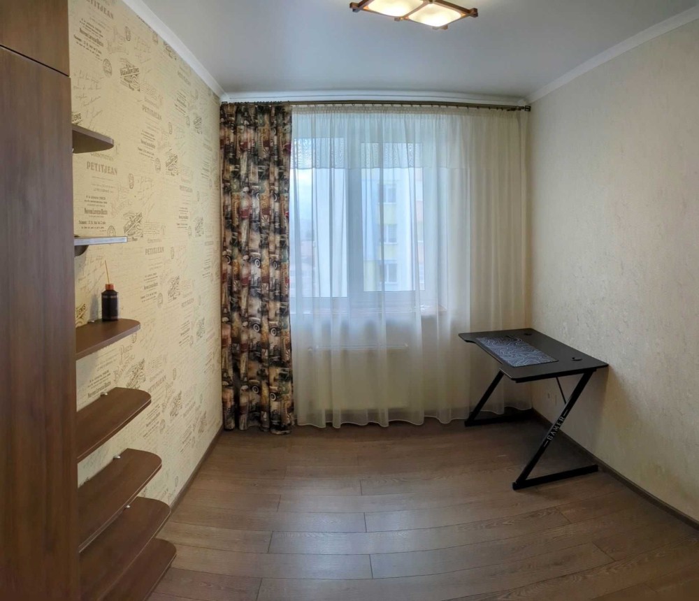 Двокімнатна квартира з великою кухнею та окремим місцем під комп'ютер.