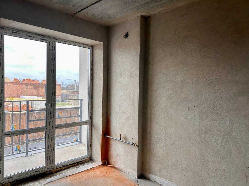 В квартирі чистова стяжка на підлозі, штукатурка несучих стін, вхідні двері, двері на балкони;