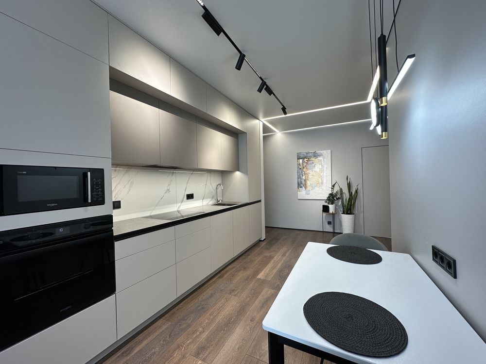- Вбудована техніка топових виробників : холодильник, посудомийна машинка, духова шафа, варильна поверхня, мікрохвильовка, пральна машина, сушильна машина;