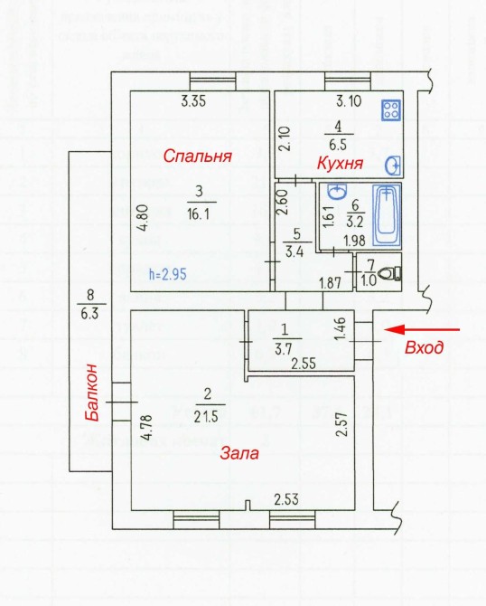 Общая площадь 55,9 м. Зала 21,6 м, спальня 16,1 м, кухня 6,5 м.