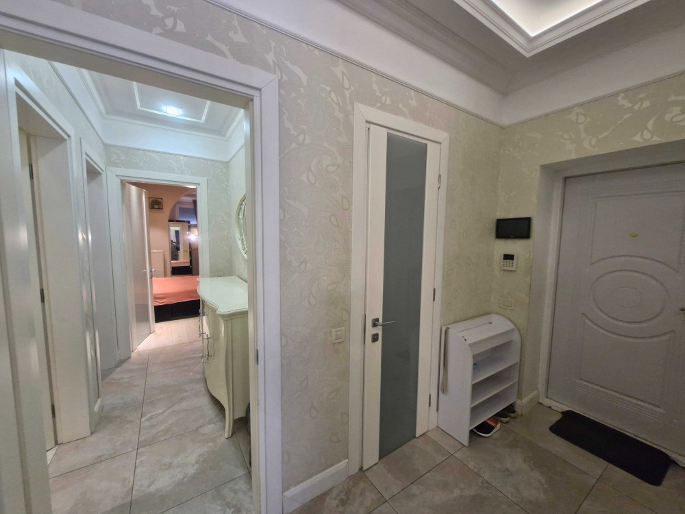 Очень теплая уютная квартира, общая площадь 100 кв.м, просторная кухня-столовая соединена с гостиной, детская комната, спальня с гардеробной и выходом на балкон. Два санузла, т/ванна, душевая кабина, теплые полы.