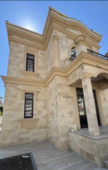 Фасад отделан натуральным травертином.
