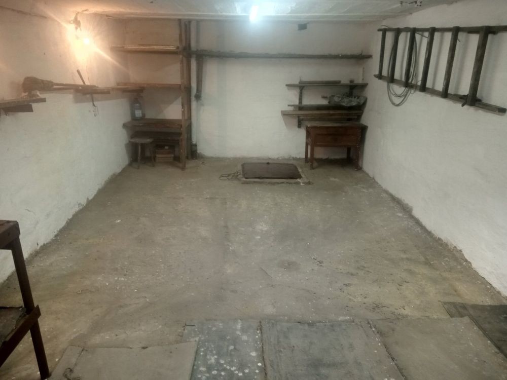 Сухой, крыша перекрыта, подвал, стеллажи, светлый внутри (побелен), хорошее освещение, отличные соседи.