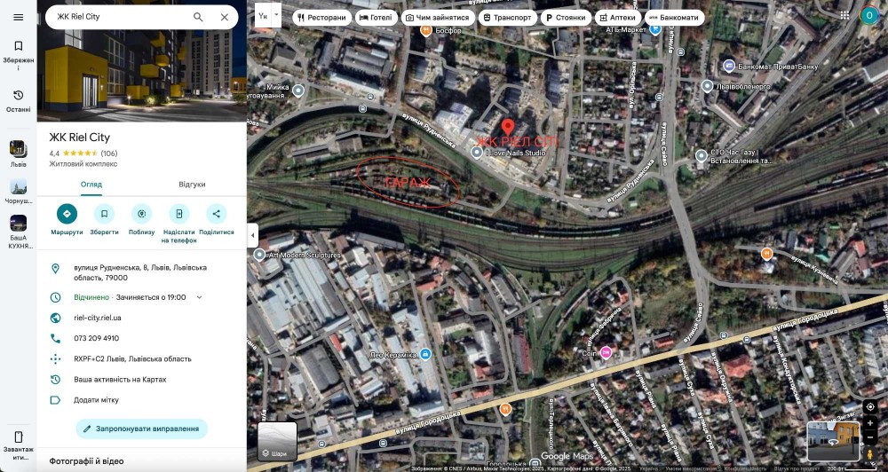 Гаражний кооператив знаходиться одразу напроти ЖК Ріел Сіті (карта розміщення додана).