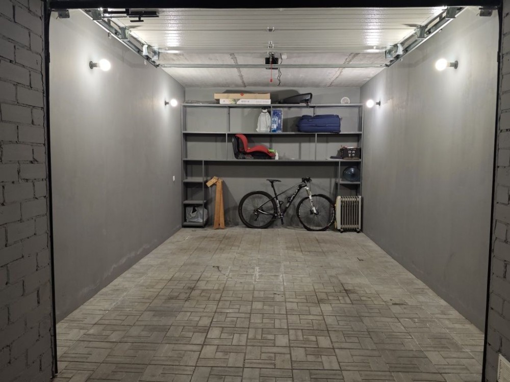 Сухий цегляний гараж на закритій території, плитка, світло, зарядка для електромобіля.